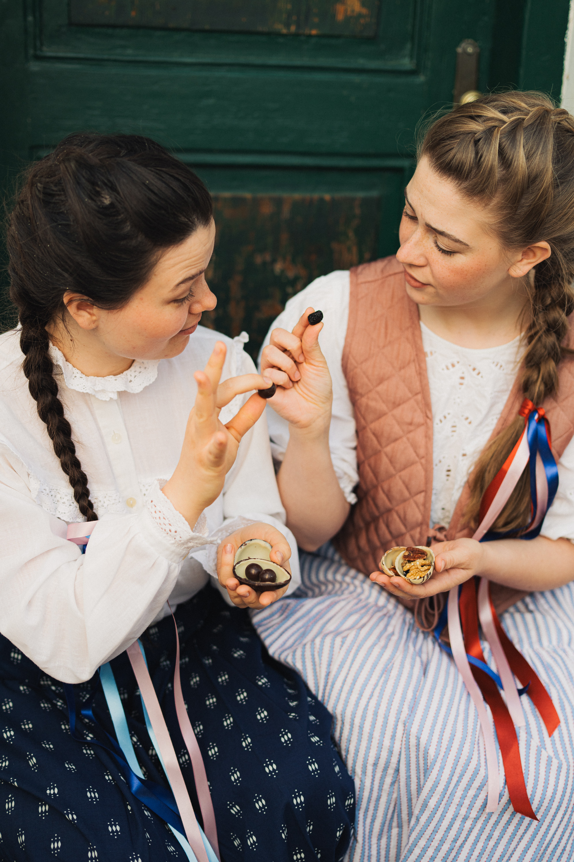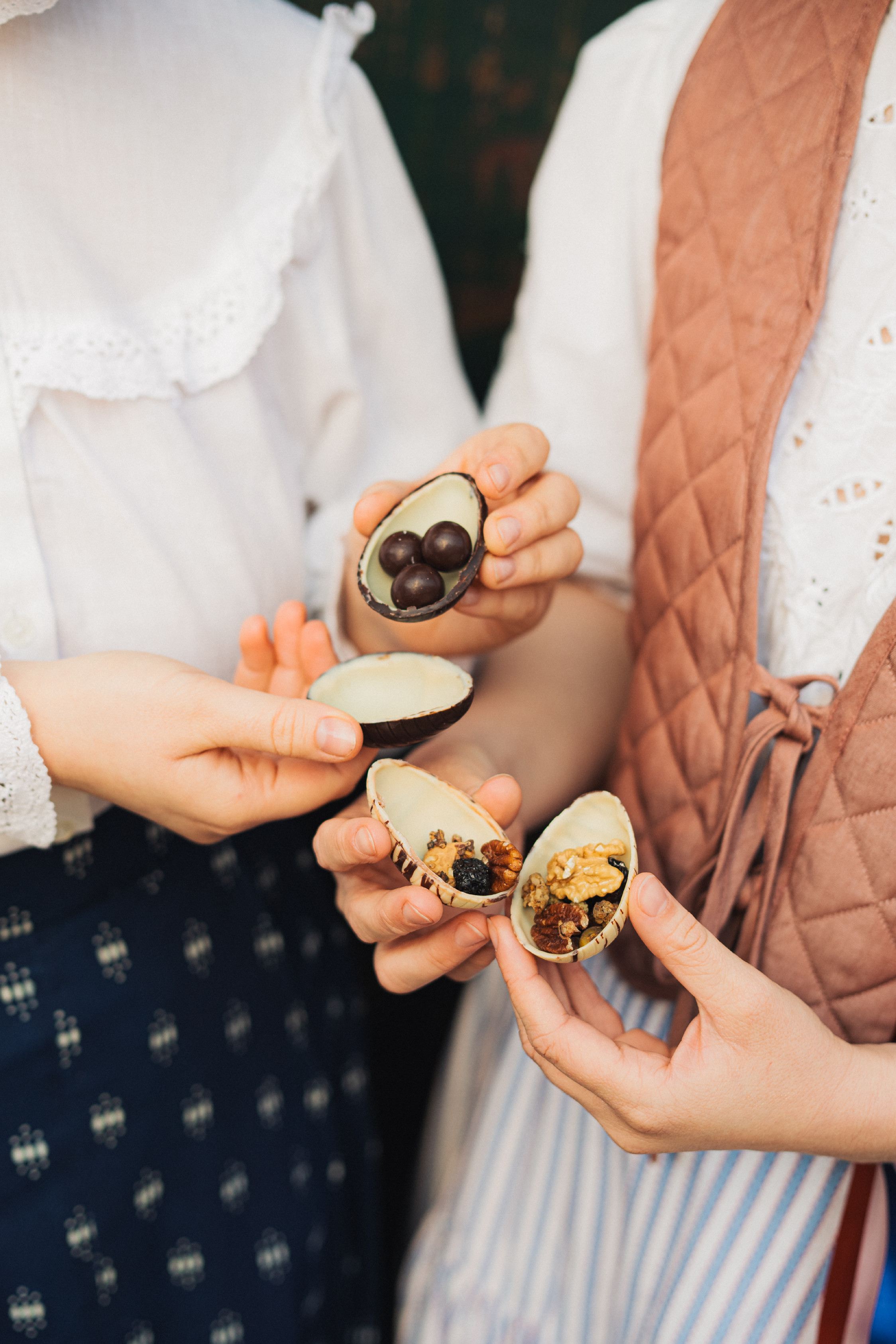 *Složení překvapení ve vajíčkách: Dle varianty v různém poměru: lískové ořechy v čokoládě [tmavá čokoláda (bio kakaové boby, bio sušená třtinová šťáva, kakaové máslo), lískové ořechy], kešu ořechy s nibsy a panelou [kešu ořechy, drcené bio kakaové boby, bio sušená třtinová šťáva], mandle v čokoládě a skořici [mléčná čokoláda (bio kakaové boby, bio sušená třtinová šťáva, kakaové máslo, bio sušené plnotučné mléko), mandle, skořice], směs ořechů a sušeného ovoce - piniové ořechy, vlašské ořechy, pistácie, pekanové ořechy, lískové ořechy, kešu ořechy, makadamové ořechy, rozinky sultánky [rozinky, slunečnicový olej], moruše, klikva [klikva, jablečný koncentrát, slunečnicový olej], třešně, višně [višně, slunečnicový olej], rozinky jumbo [rozinky, slunečnicový olej]).