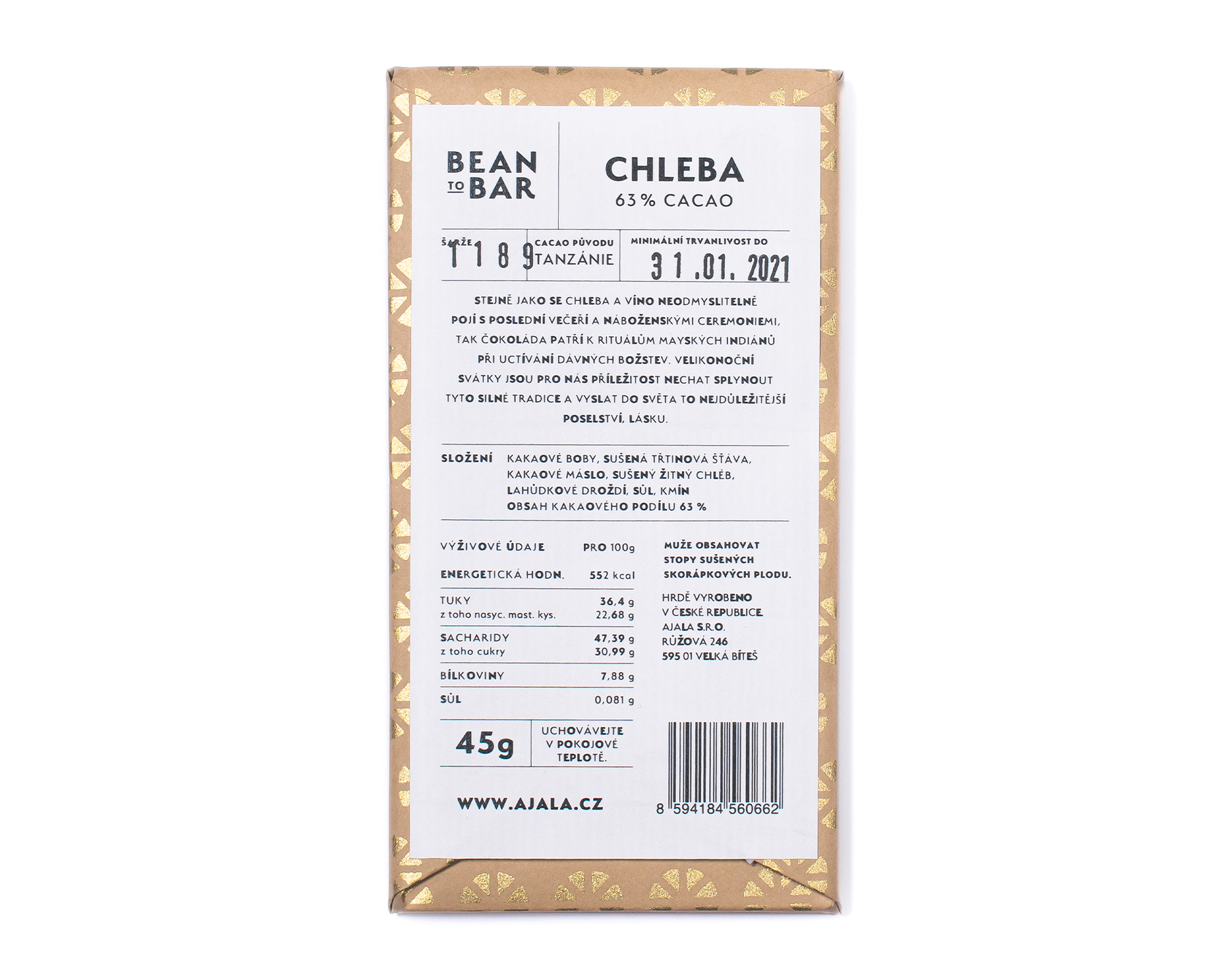 | Složení | bio kakaové boby, bio sušená třtinová šťáva, bio kakaové máslo, sušený žitný chléb, lahůdkové droždí, sůl, kmín |