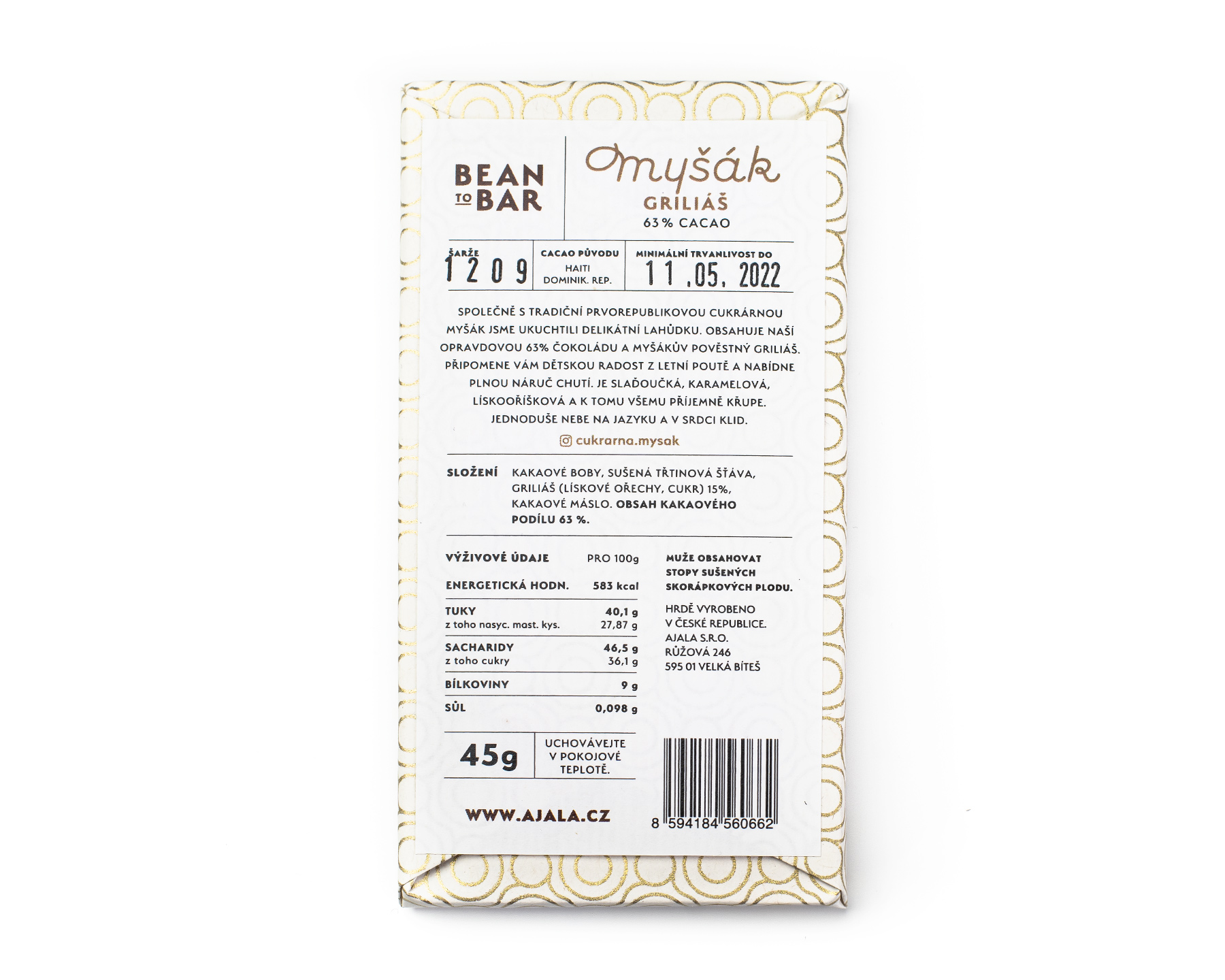 | Složení | bio kakaové boby, bio sušená třtinová šťáva, Myšákův griliáš (lískové ořechy, cukr) 15 %, bio kakaové máslo |