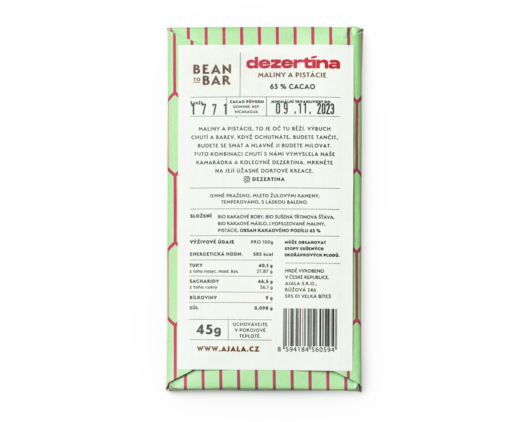 | Složení | bio kakaové boby, bio sušená třtinová šťáva, bio kakaové máslo, lyofilizované maliny - prášek 3 %, pistácie 3 % |