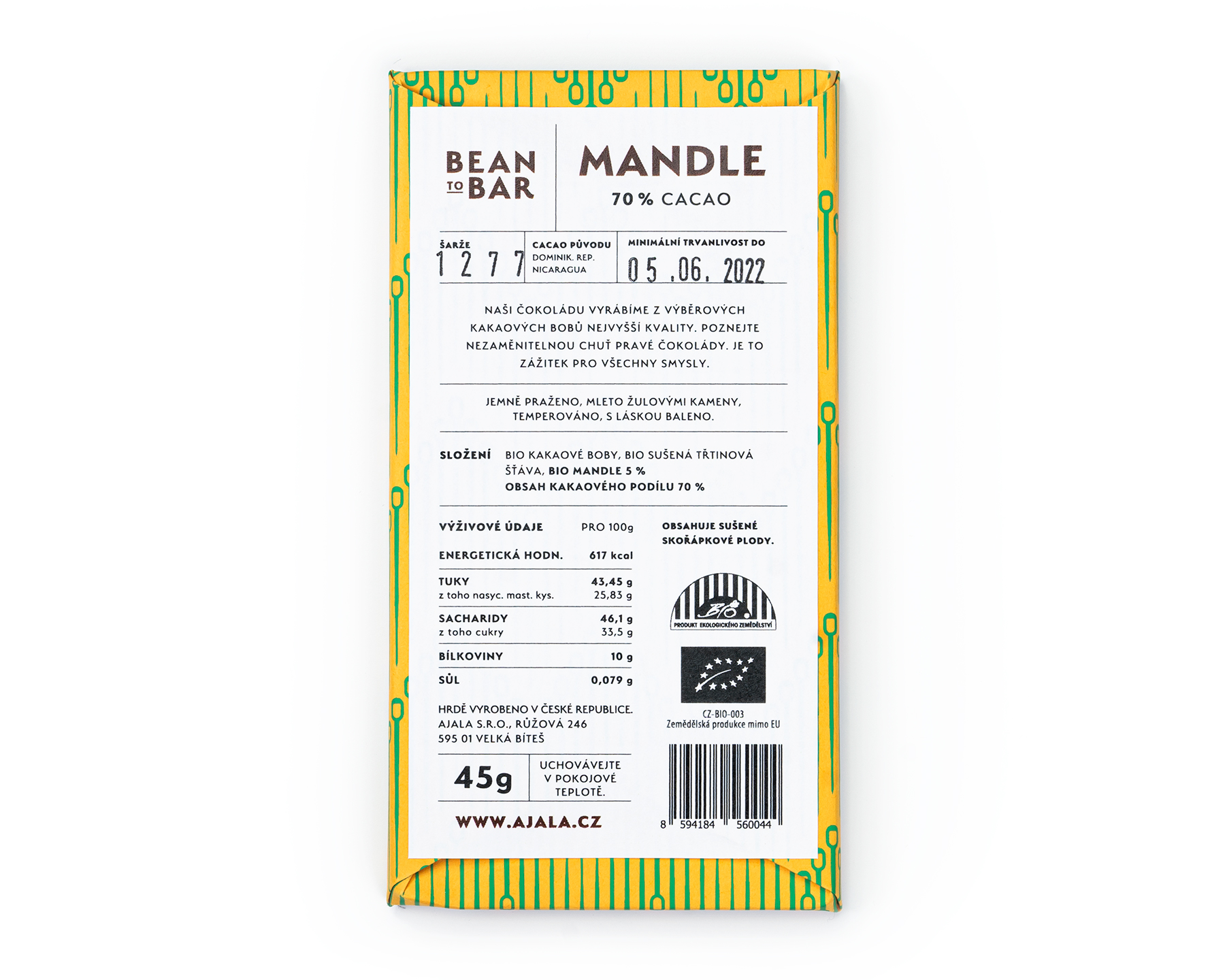 | Složení | bio kakaové boby, bio sušená třtinová šťáva, bio mandle 18 %, bio kakaové máslo |
