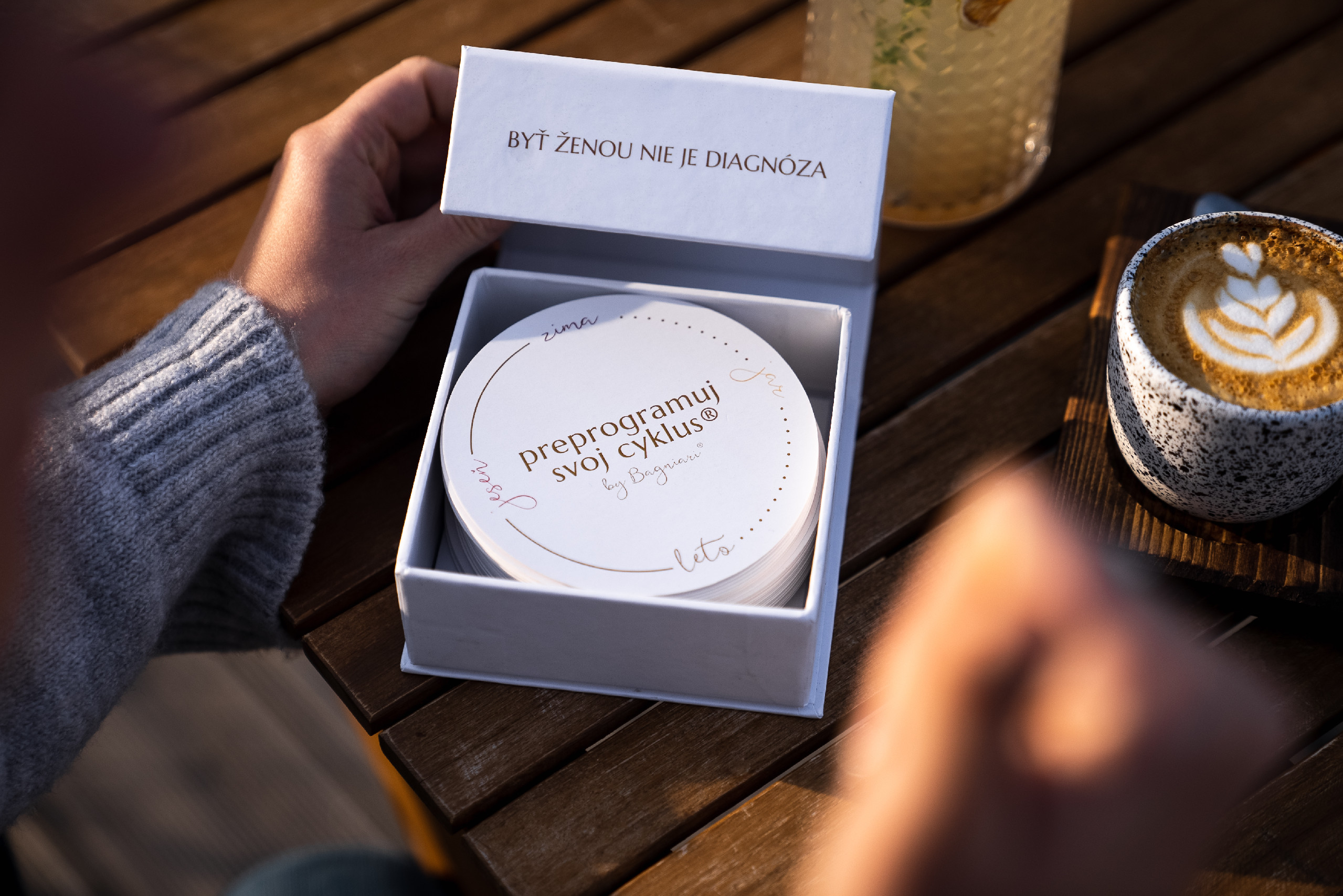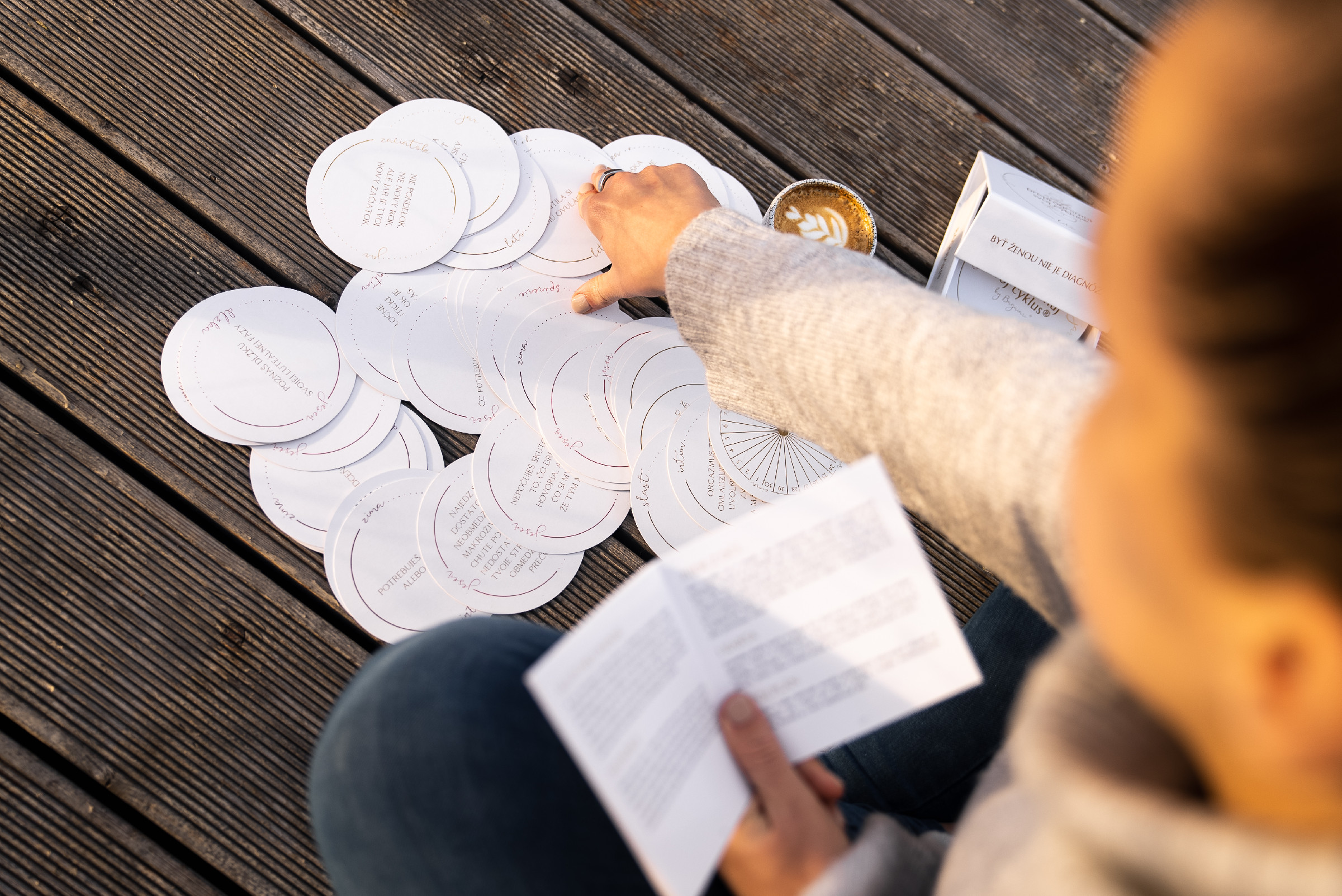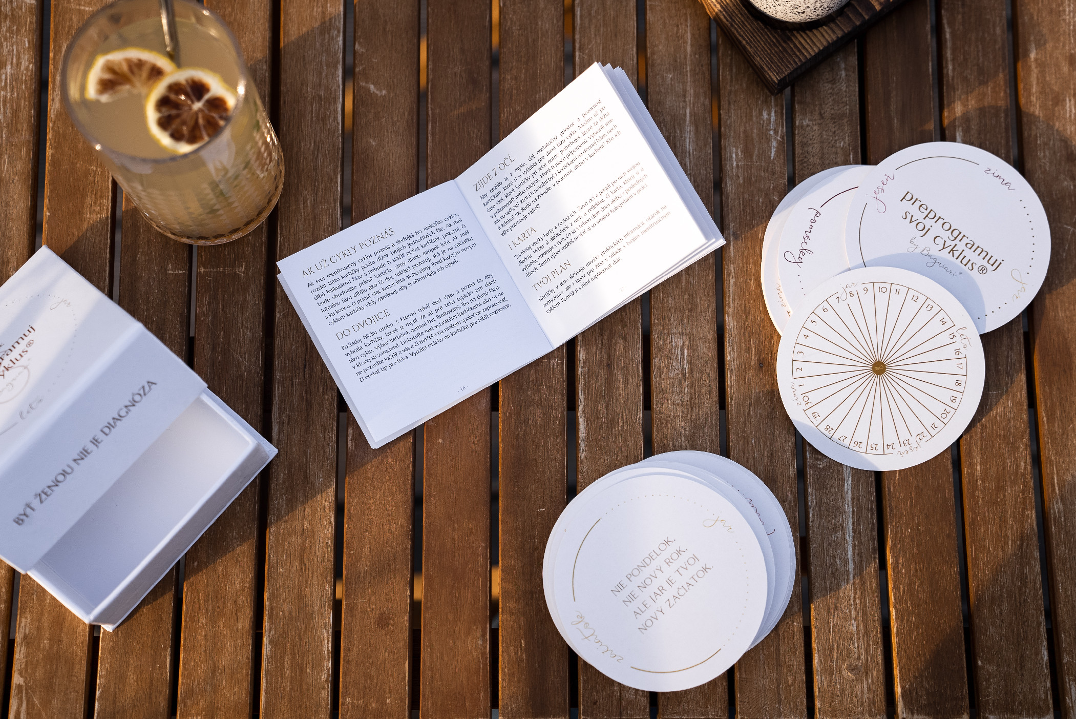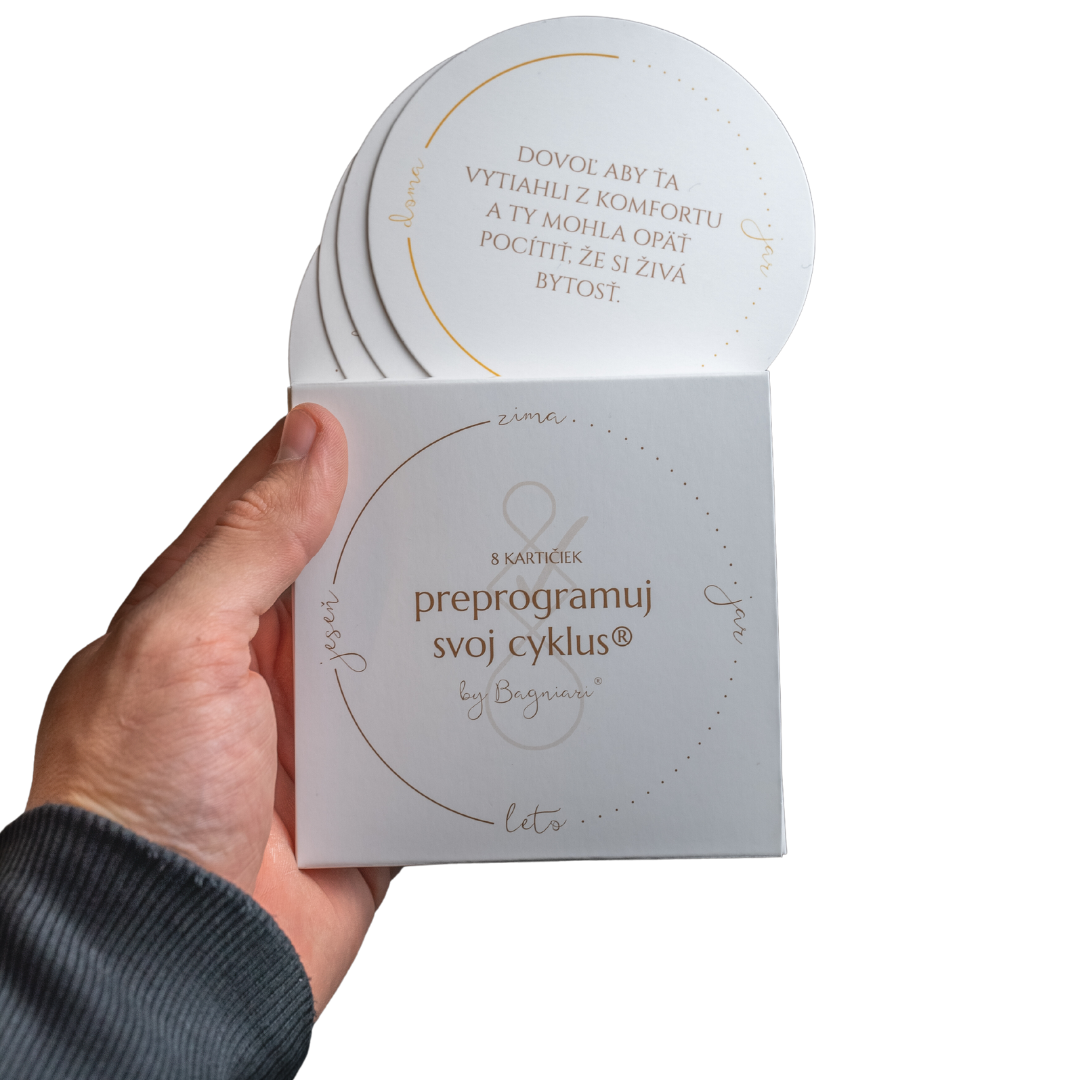 Původní balíček obsahuje 48 kartiček, rozdělených do 4 kategorií s názvem jar, leto, jeseň, zima plus ještě něco navíc. Každá ze 4 kategorií obsahuje 12 kartiček, které můžeš využít jako nástroj na sledování svého menstruačního cyklu, zdroj poznání, každodenní připomínku nebo jako pomůcku pro vytvoření individuálního měsíčního plánu. Najdeš zde i 4 karty navíc.