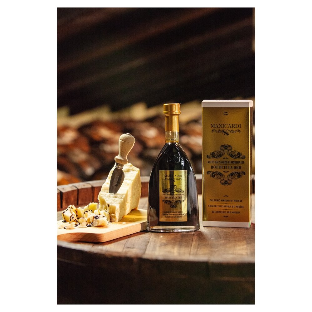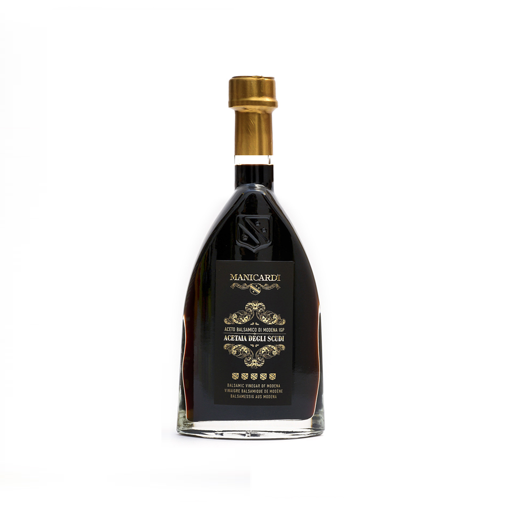 Tento balzamikový ocet z Modeny je produktem pečlivého zrání ve speciálních sudech z kaštanu, dubu, třešní, akácie a moruše s převahou jalovce.