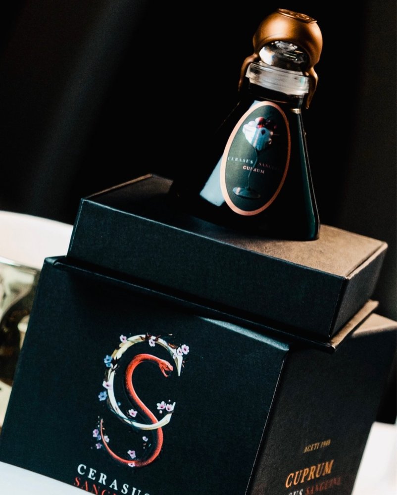 Balsamikový ocet z třešní Cerasus Sanguine se vyrábí inovativním procesem zrání, který umožňuje získat nezměněný, pravý a voňavý produkt, který dokáže zvýraznit chuť pokrmů. Díky tomuto speciálnímu procesu si zachovavá vlastnosti suroviny, ze které je vyroben.
