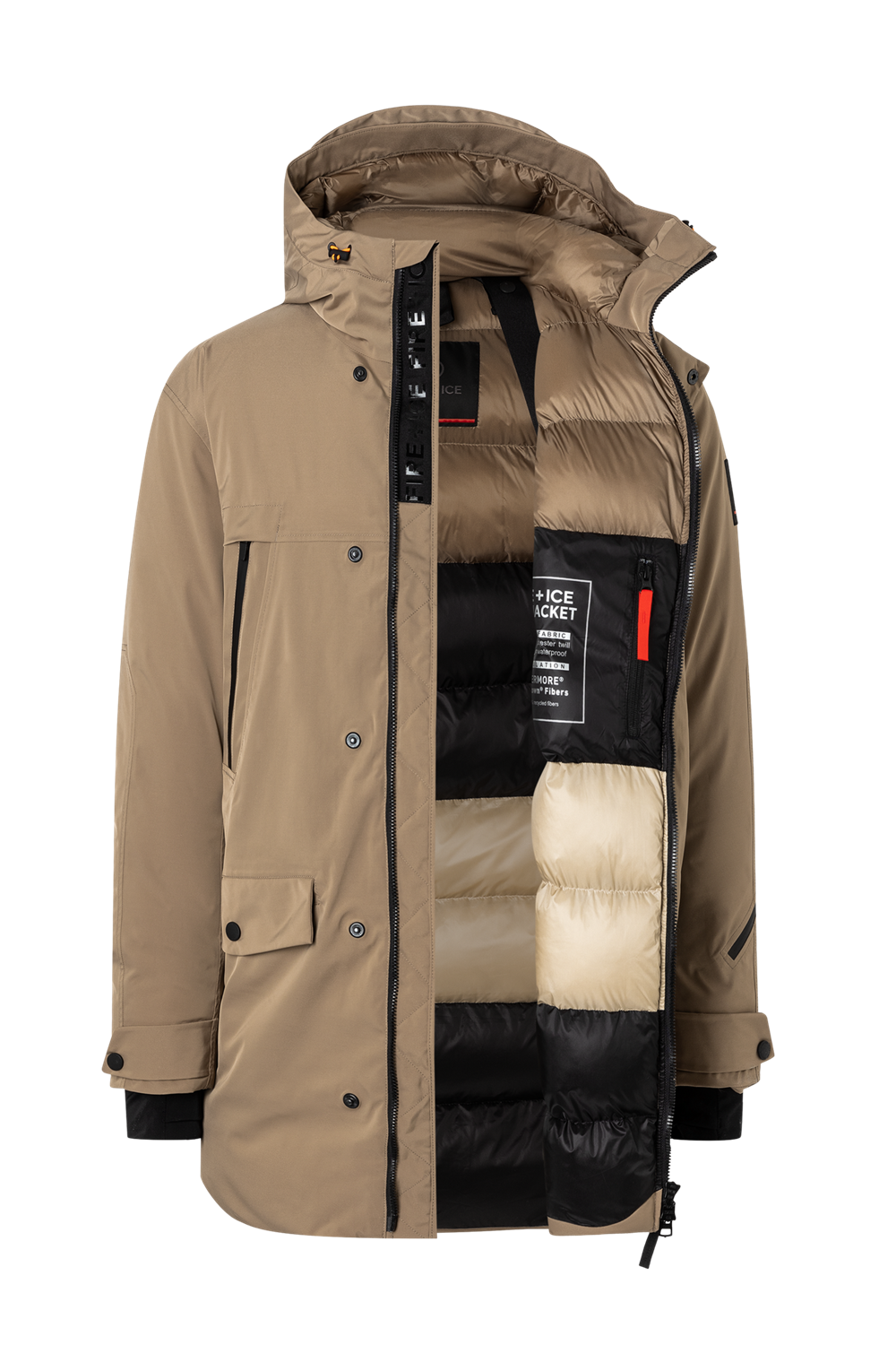 - vrecká: dve hrudné vrecká na zips, dve bočné vrecká s chlopňou a zapínaním na cvoky, zadné bočné vrecko na zips, vrecko na skipas a nášivka FIRE+ICE na ľavom rukáve, vnútorné vrecko na zips