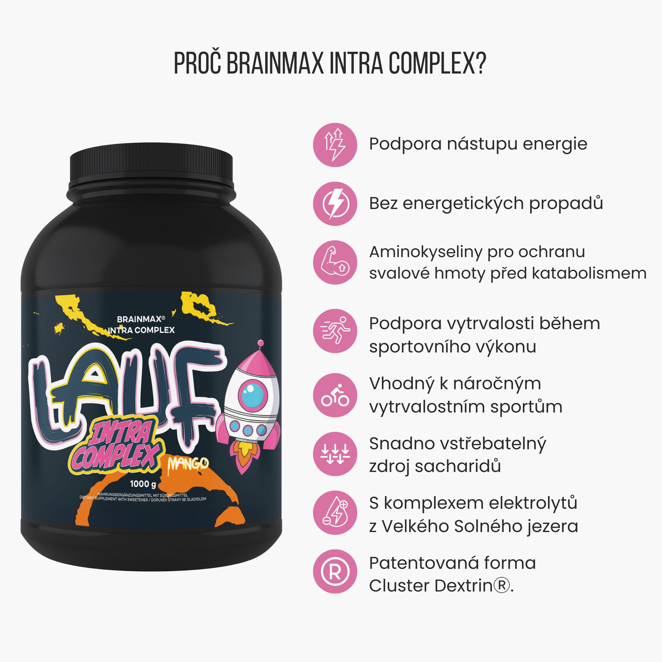 BrainMax LAUF Intra Komplex obsahuje patentovaný Cluster Dextrin®, spolu s kompletním spektrem aminokyselin a elektrolyty. Dohromady poskytují efektivní výživu pro svaly, podporují rychlou regeneraci, stabilní energii a hydrataci. Je vhodný pro sportovce, kteří ze sebe chtějí při intenzivních trénincích získat maximum a zároveň zajistit dostatečnou ochranu svalů a jejich regeneraci.