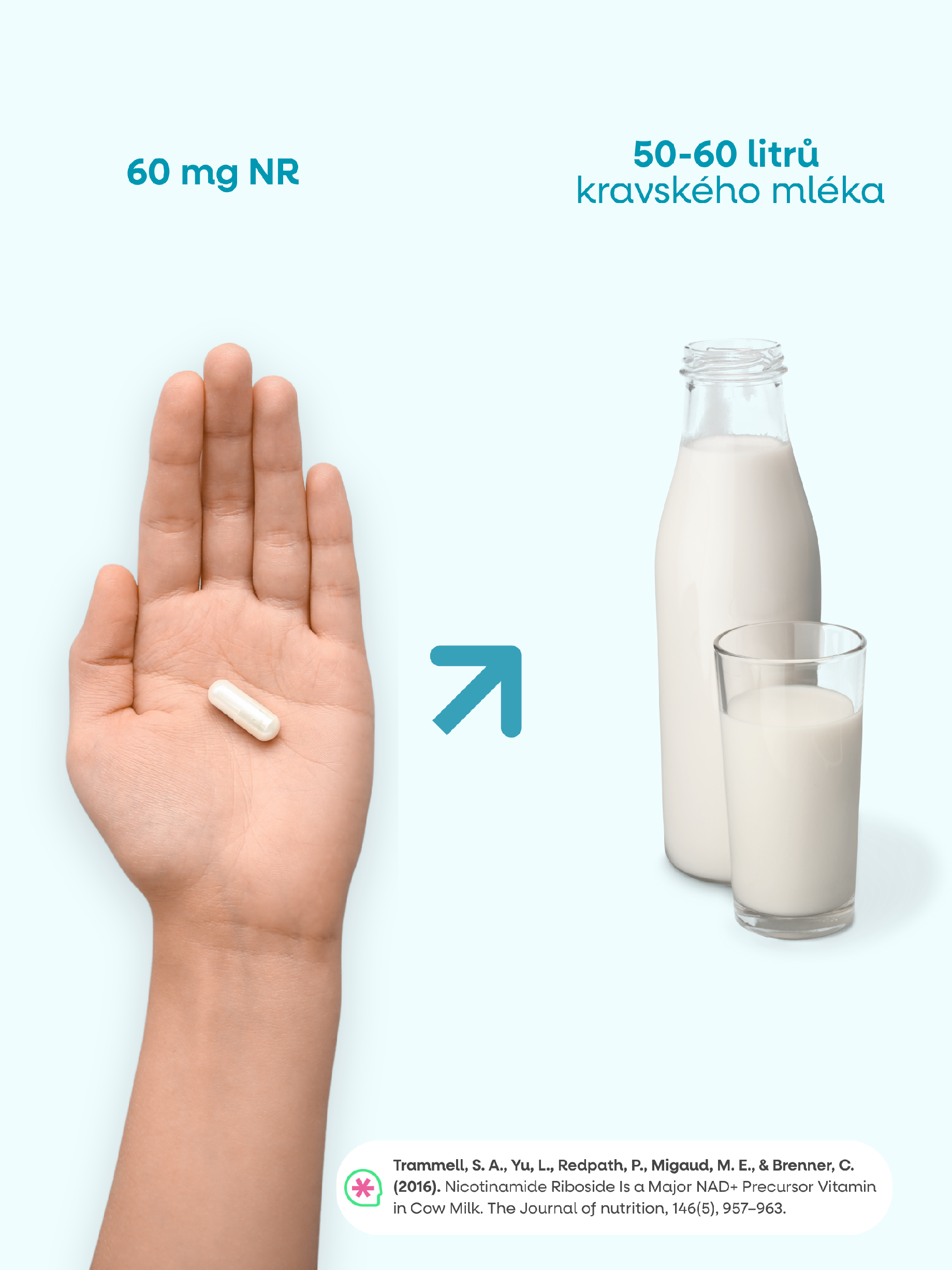 NR hraje klíčovou roli v energetickém metabolismu1. Kombinace s TMG a pterostilbenem (polyfenolem s vysokou biologickou dostupností) je cílená na optimalizaci metabolismu NAD+ a aktivaci sirtuinů. Dávka 300 mg odpovídá přibližně 100 mg niacinu. Oproti niacinu ale nezpůsobuje zarudnutí pokožky a je tak vhodný pro dlouhodobé užívání v rámci longevity protokolů.