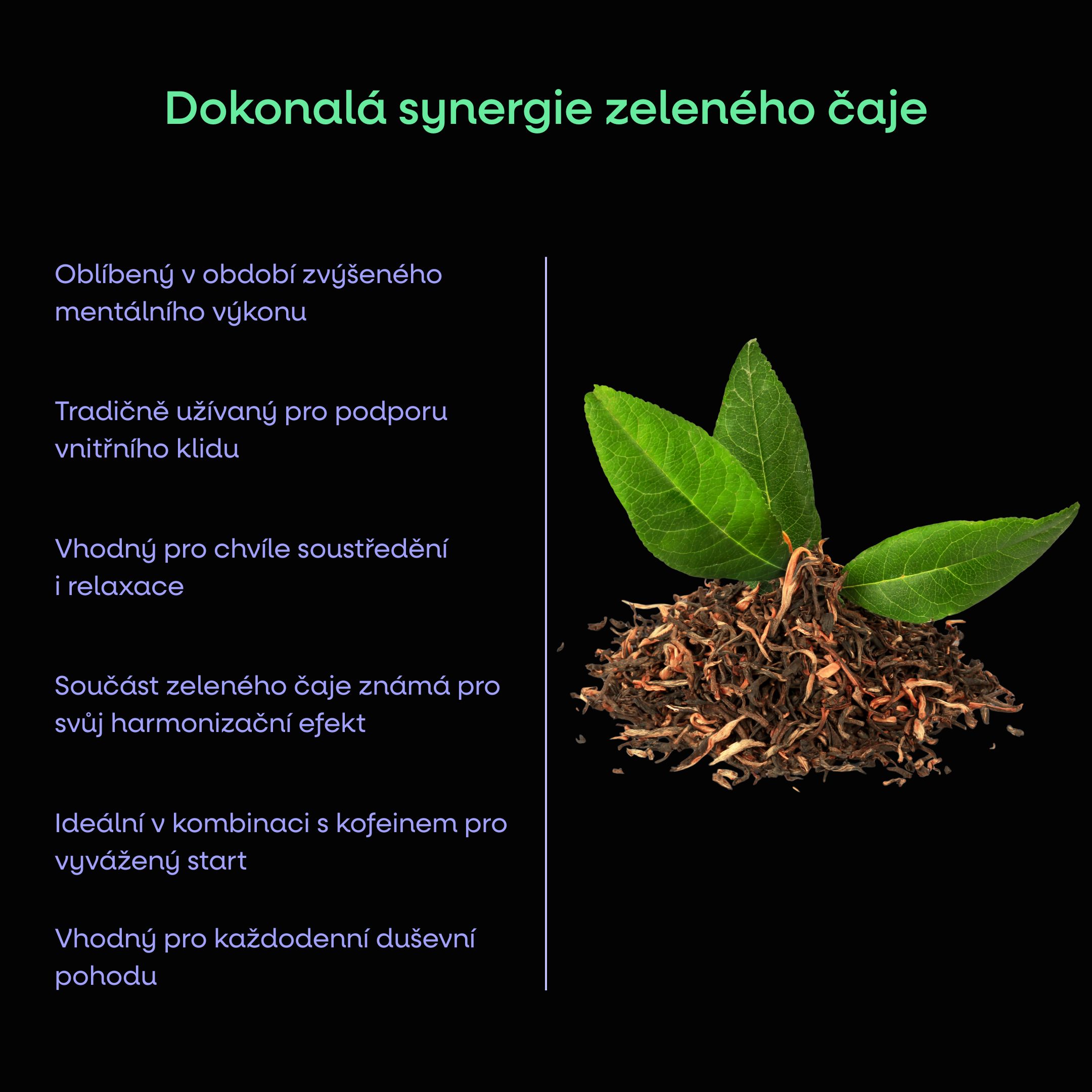 - L-theanin je aminokyselina přirozeně se vyskytující v listech zeleného čaje, které jsou tradičně spojovány s antioxidačními schopnostmi, duševní bdělostí, kognitivním výkonem a schopností koncentrace.1