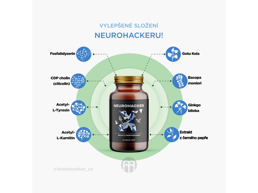 Díky látkám obsaženým v upgradovaném Neurohackeru budete moci v klidu využívat potenciál a kapacitu vašeho mozku, ať už v zaměstnání nebo ve škole, protože Neurohacker je komplex 8 účinných látek, který byl ušit na míru pro studenty, mentálně pracující lidi pro udržení normální funkce mozku na správném levelu.