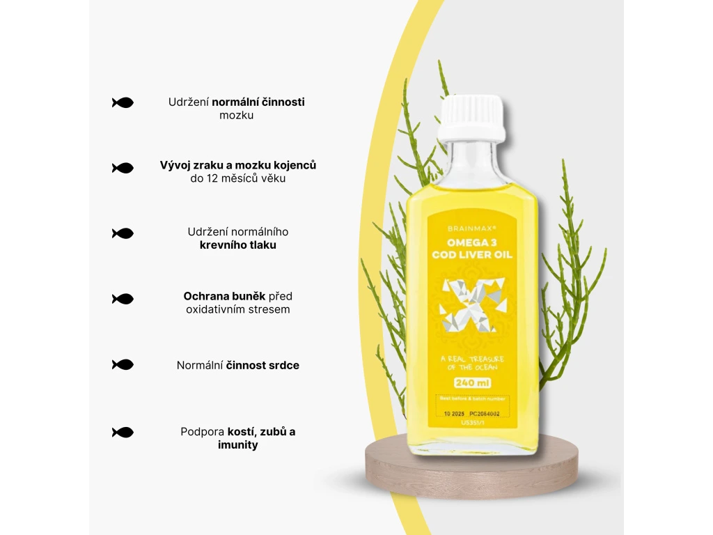 Rozhodli jsme se na trh přijít s vlastním olejem, kde v jedné polévkové lžíci najdete obsah mastných kyselin DHA a EPA rovnající se 3 až 8 želatinovým kapslím za nesrovnatelně nižší cenu, ale ve vysoké kvalitě. BrainMax olej z tresčích jater je totiž chráněn před oxidací vitamínem A i E, což umožňuje mnohem lepší využitelnost pro naše buňky. Zoxidovaný rybí olej poznáte tím, že buď páchne rybinou anebo navozuje trávicí obtíže. Jako důkaz kvality můžete vyzkoušet jednoduchý test, kdy si dáte nalačno 2 polévkové lžíce našeho oleje a nepříjemné rybiny nebo trávicích potíží se nemusíte obávat. Olej v takové kvalitě je pro organismus přínosem, a tak s ním můžete bezpečně doplňovat DHA i EPA.