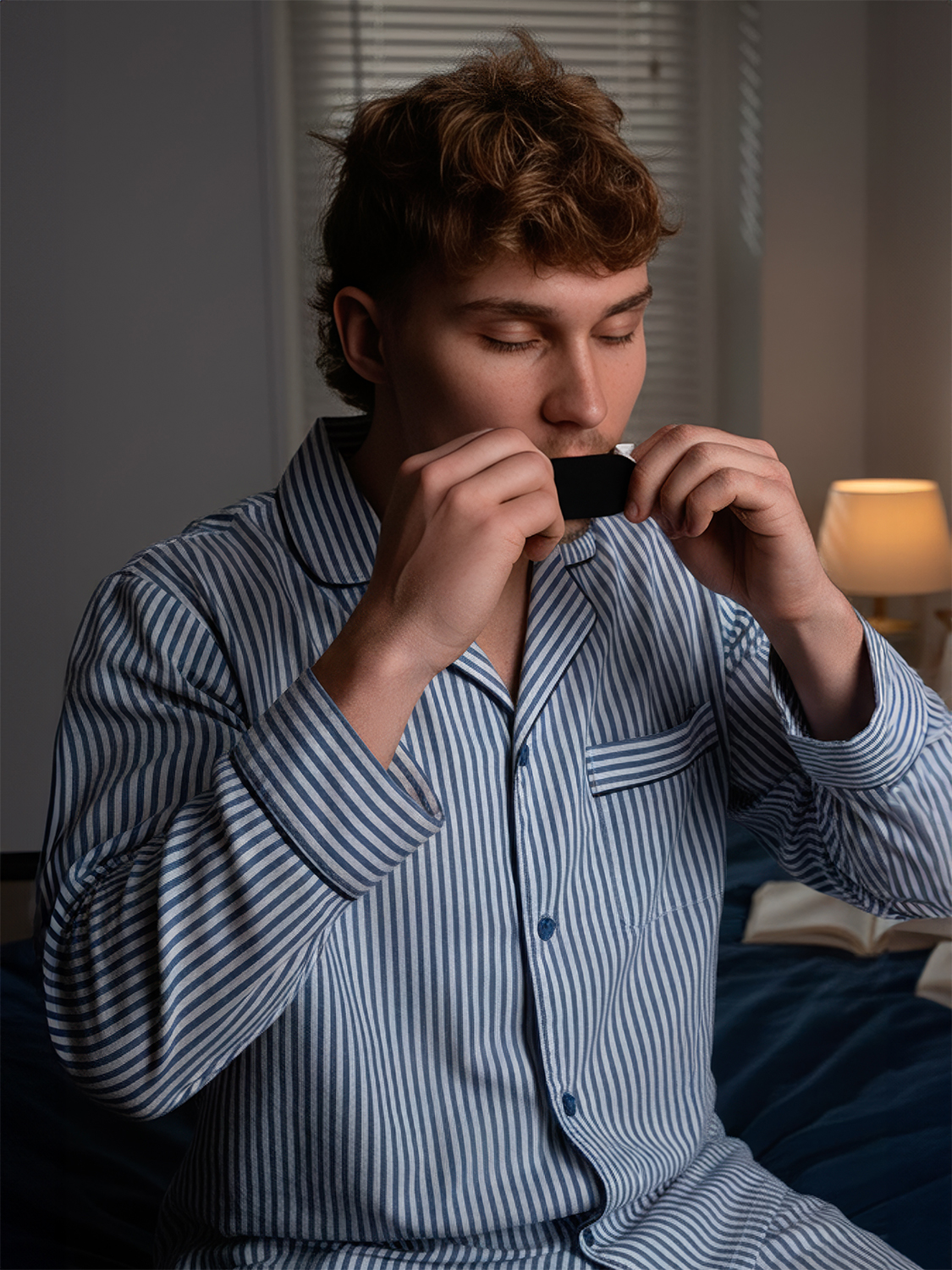 Upozornění: Pouze pro vnější použití. Nepoužívejte při nasálních dýchacích potížích, body mass index nad 35, silně popraskaných rtech, požití alkoholu nebo sedativ, nachlazení, infekci dutin nebo uší, srdečních či dýchacích potížích, velmi nízkém krevním tlaku nebo pokud máte citlivou pokožku, otevřené rány nebo kožní problémy v oblasti kolem úst. V případě podráždění přerušte používání. Uchovávejte mimo dosah dětí. V případě pochybností se před použitím poraďte s lékařem.