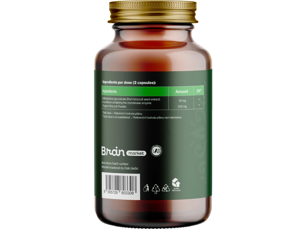 Složení: Sulforafan glukosinát (z extraktu semen brokolice - Brassica oleracea) ve vlastní směsi obsahující enzym mirosinázy 35 mg, brokolicový prášek BIO 250 mg. Rostlinná kapsle na bázi HPMC.