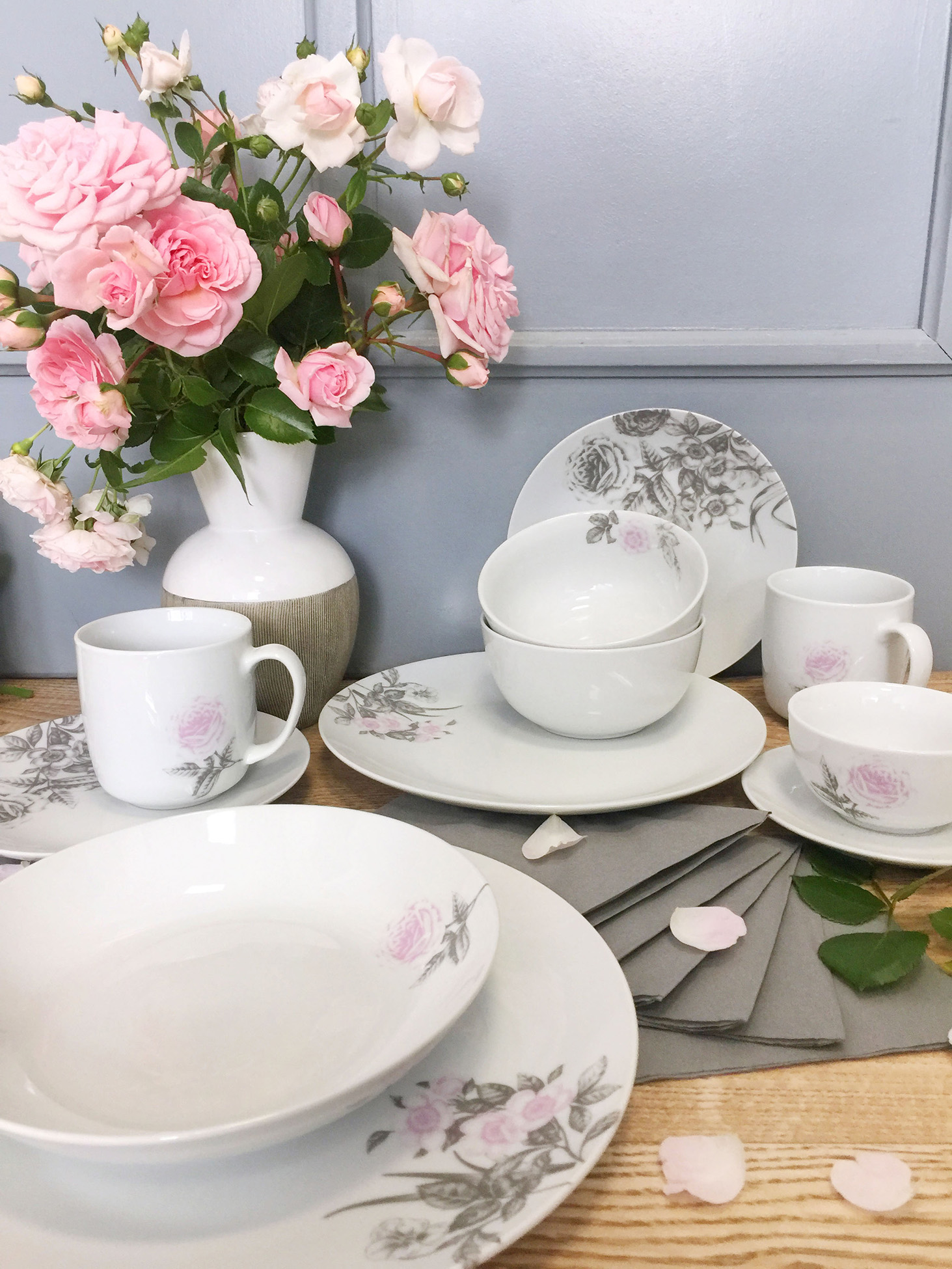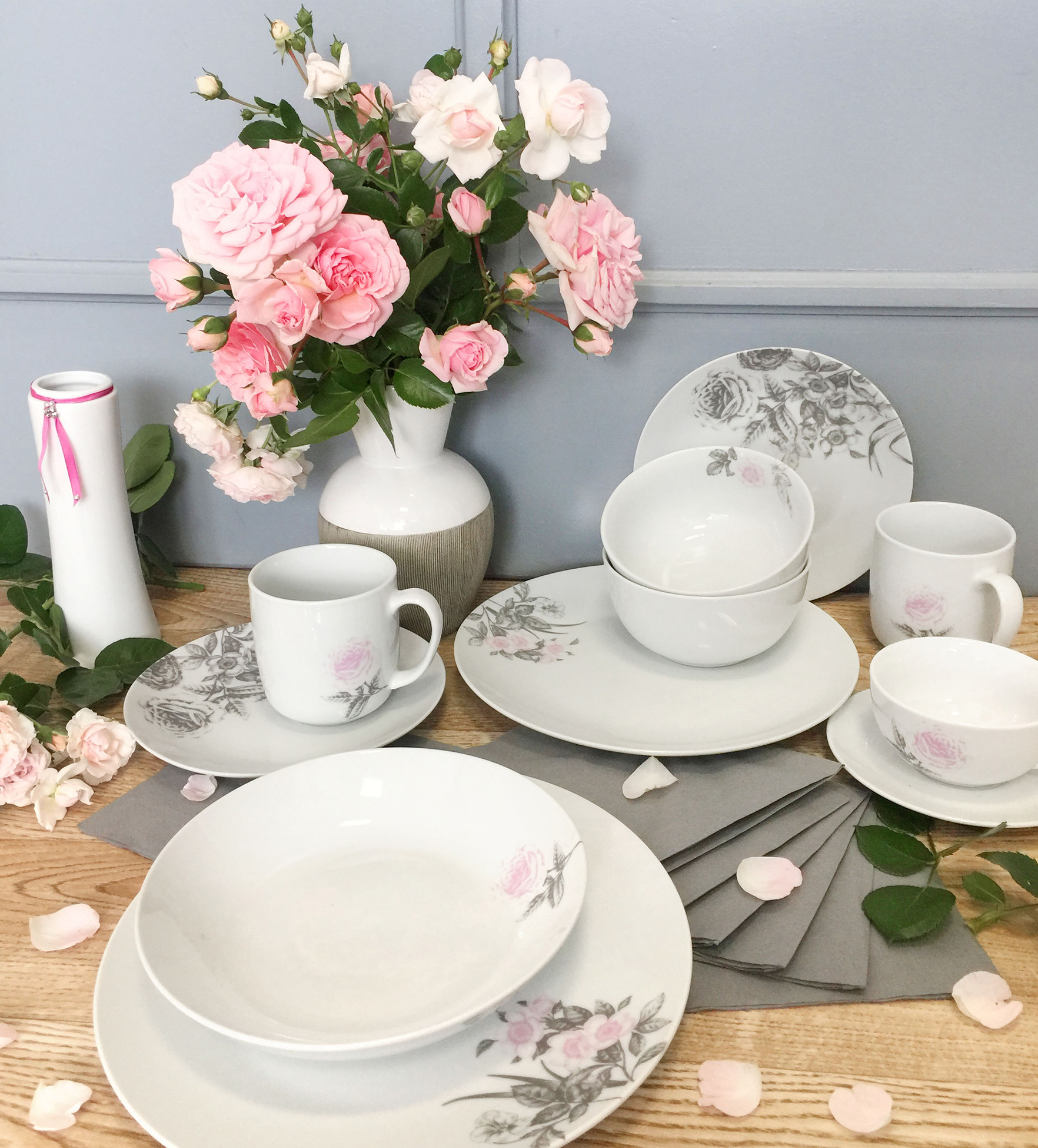 Kolekce Rose české značky by inspire s motivy růží v šedorůžové kombinaci je elegantní a slavnostní. Tato růže Vám nikdy neuvadne a vždy potěší při každé příležitosti u prostřeného stolu.
