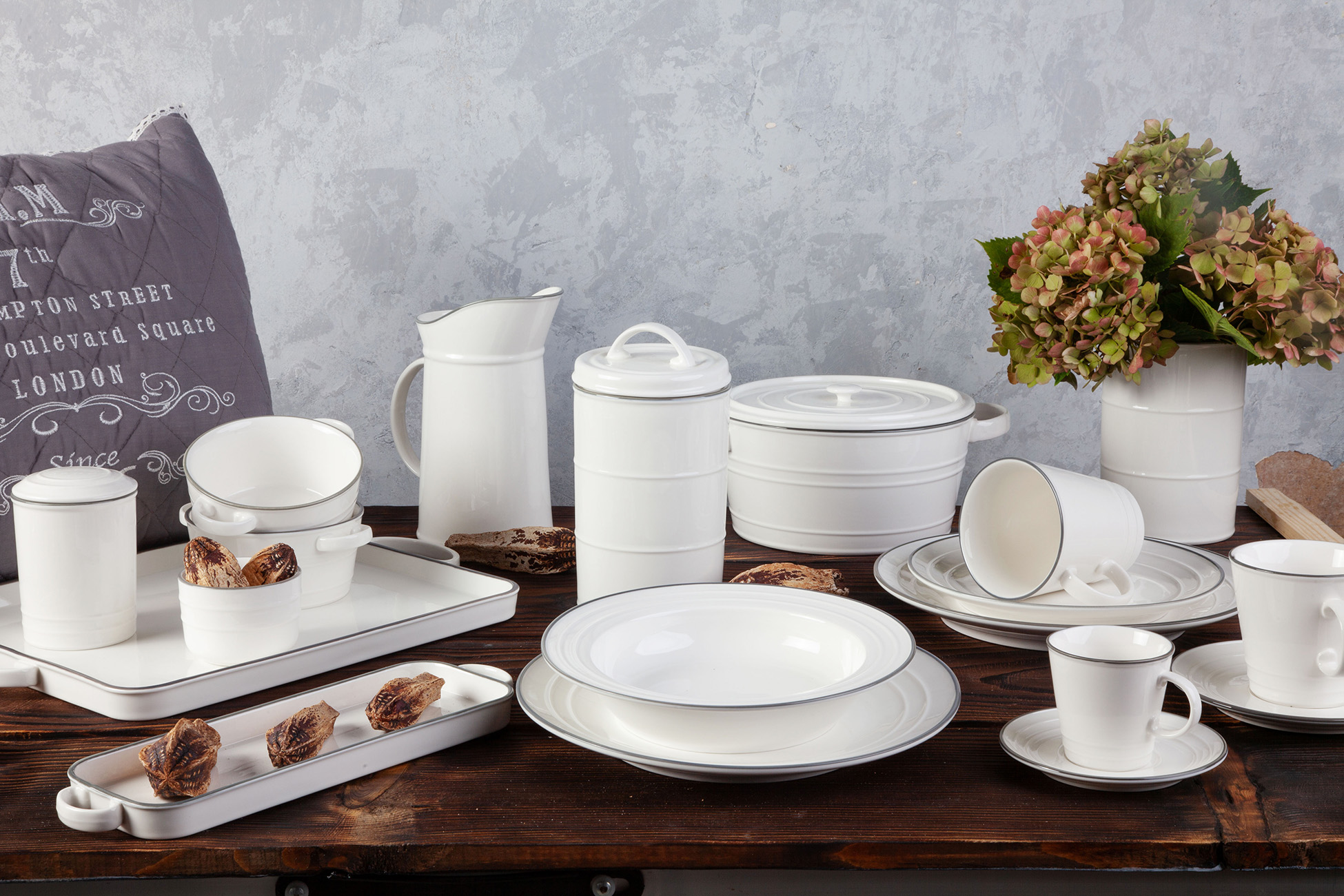 Design, který si pohrává s netradiční kombinací tvaru a materiálu. Tvar tak typický pro smaltované nádobí našich babiček a použitý materiál jakostní porcelán, působí mile a vlídně. Porcelánové talíře mají smetanový nádech a elegantní šedý proužek jen podtrhuje kontrast křehkosti a retro tvaru „kovového“ nádobí. Designové talíře v nadčasovém provedení. Moderní talíře od české značky by inspire...porcelán s českou duší.