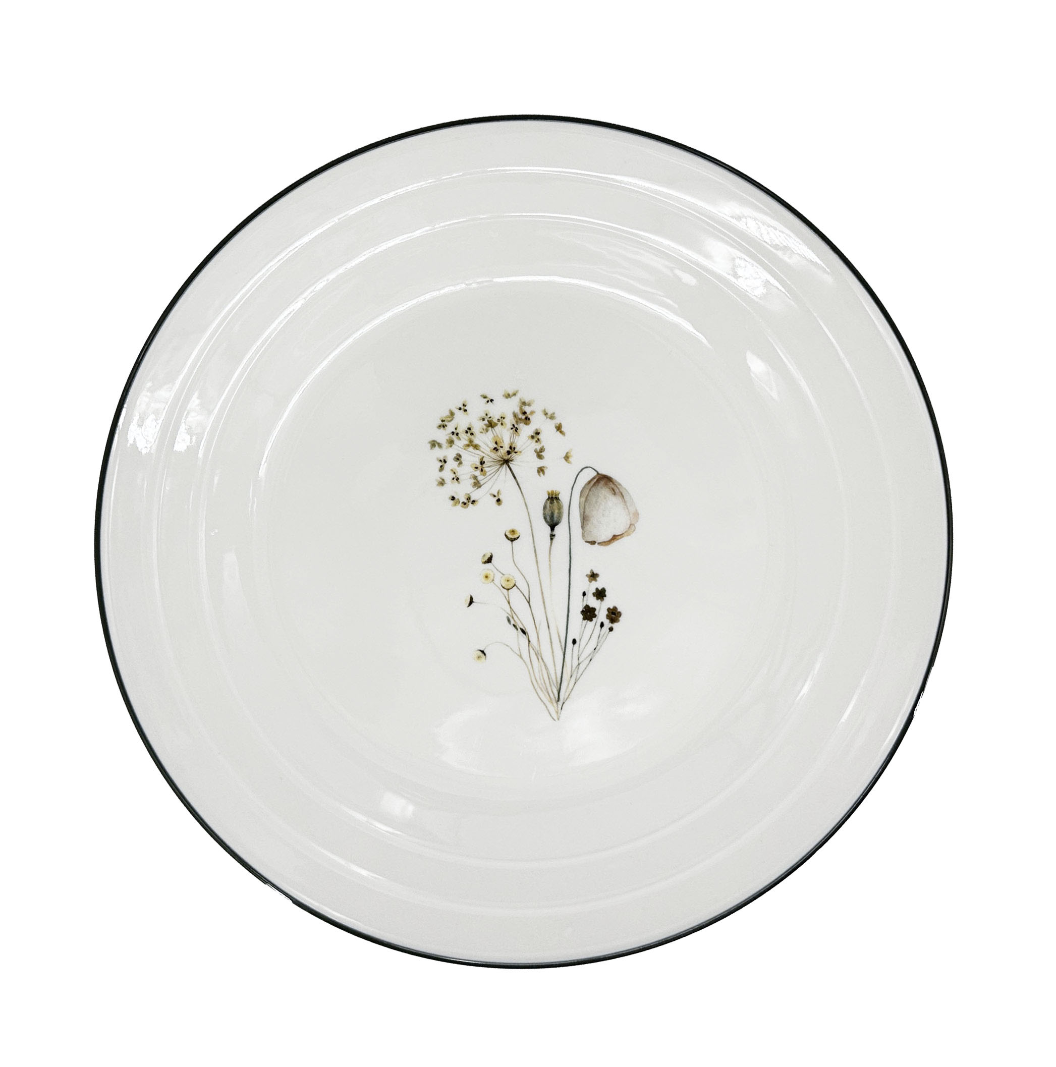 Mělký porcelánový talíř Nostalgie Meadow v sobě snoubí vintage design a křehkou eleganci lučních květin. Jemný šedý lem dodává autentický vzhled inspirovaný tradičním smaltovaným nádobím. Tento porcelánový talíř s květinovým dekorem vnese do vašeho domova kouzlo venkovské nostalgie.