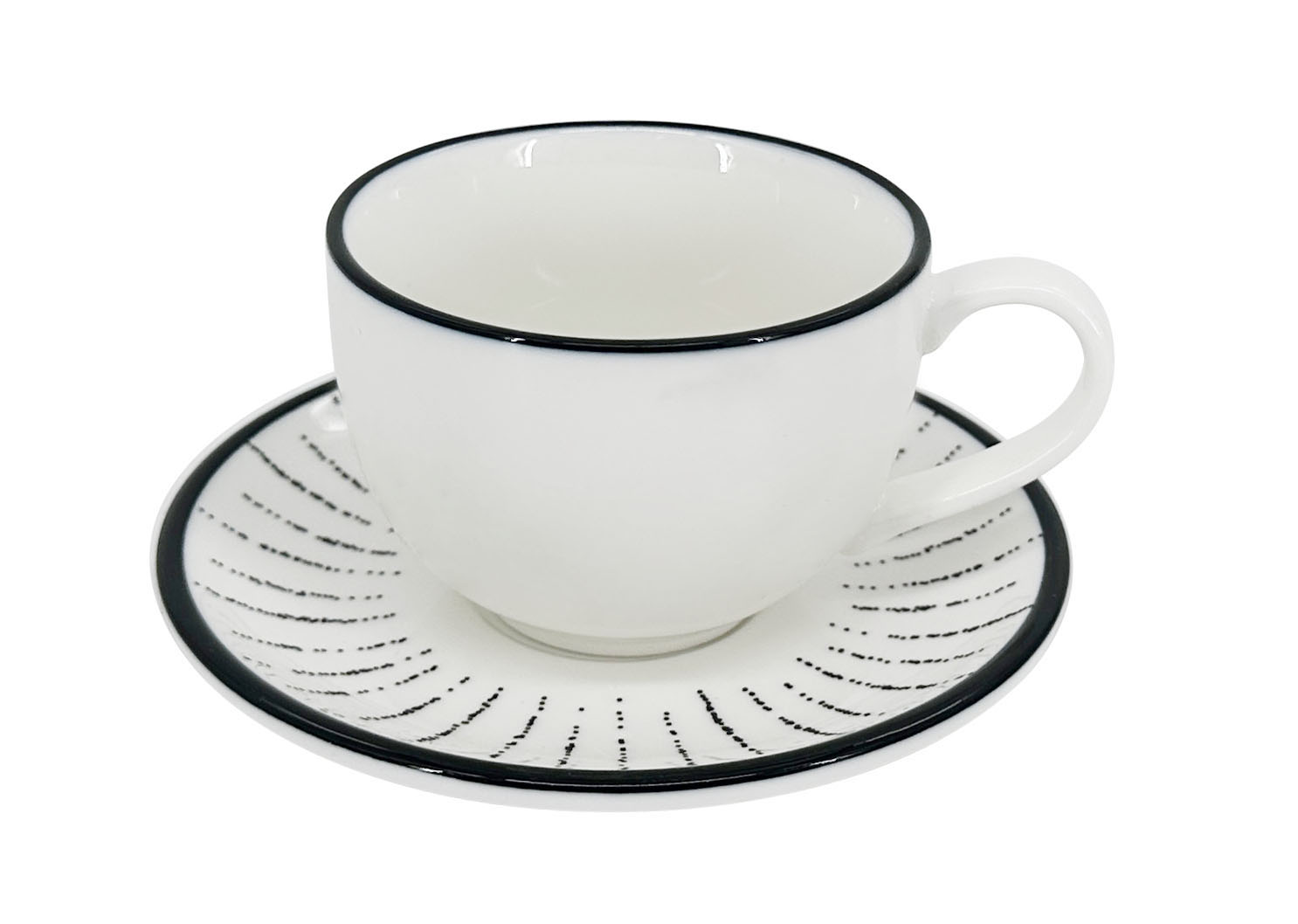 Dodejte svému stolování moderní rytmus. Set 6 ks cappuccino šálků Alba Dash o objemu 200 ml představuje originální pojetí minimalismu. Zatímco šálky si zachovávají čistou eleganci bílého porcelánu zdobeného pouze tenkou černou linkou na okraji, podšálky jsou oživeny dynamickým motivem černých paprsků (dash). Tato kombinace vytváří na stole zajímavý vizuální efekt, který je pro kolekci Alba Dash typický.