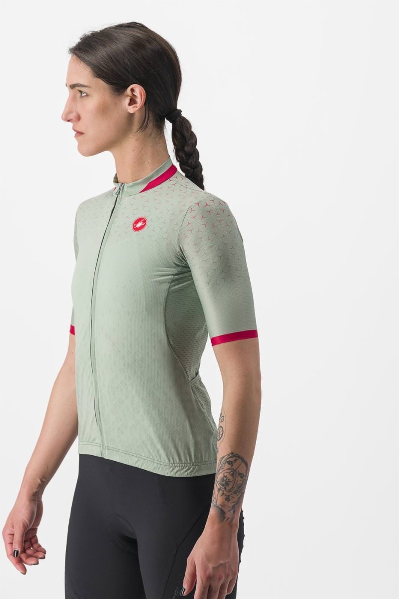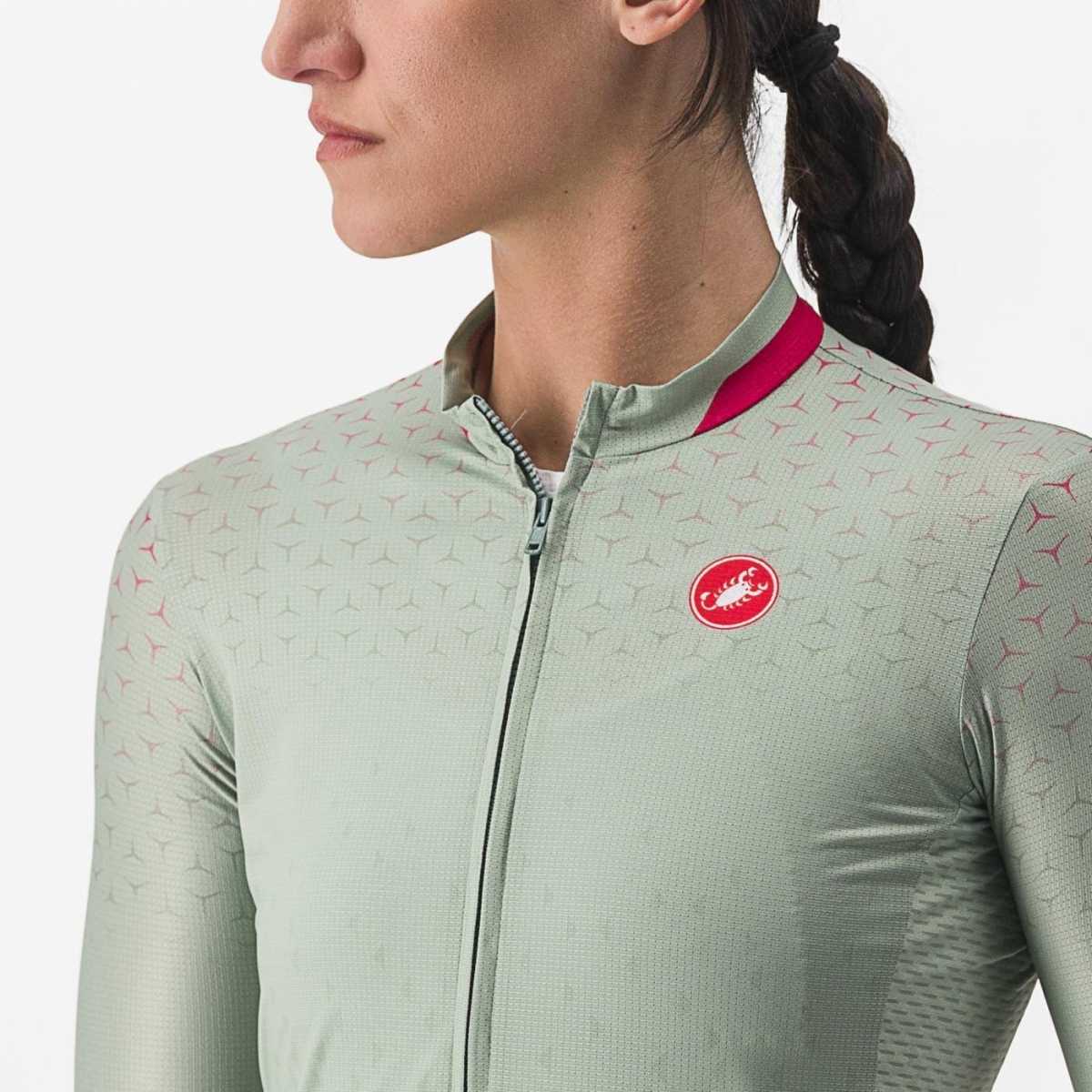 Krásný univerzálný cyklistický dres značky Castelli v pastelovej zelenej farbe. Tento dres, inšpirovaný modelom dresu Castelli Competizione 2, je ideálnou voľbo…