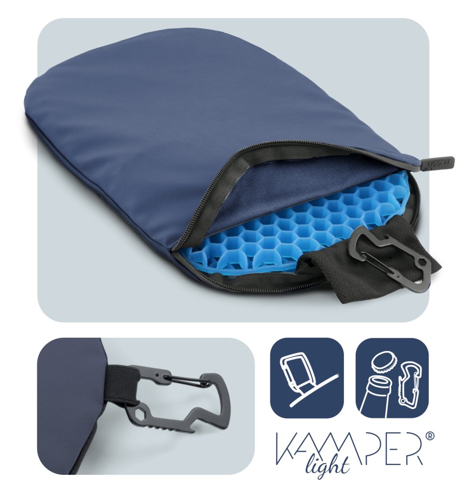 Výplň BEECELL™ je šestistranná plástová struktura, vyrobená z ekologického silikonového gelu, používaného pro medicínské účely. Design s otevřenými buňkami zabraňuje přehřívání i během horkých dnů. Zvyšuje cirkulaci vzduchu a zároveň zachovává pevnost materiálu. Odolný potah TEXSHELL™ je vyrobený z kvalitní 100% polyester tkaniny značky Oxford. Polyuretanový nátěr zajišťuje vysokou voděodolnost a zabraňuje hromadění nečistot mezi vlákny. Čištění potahu cestovního podsedáku MOSH Kamper Light je jednoduché. Snímatelný potah v případě potřeby snadno vyčistíte nebo vyperete.