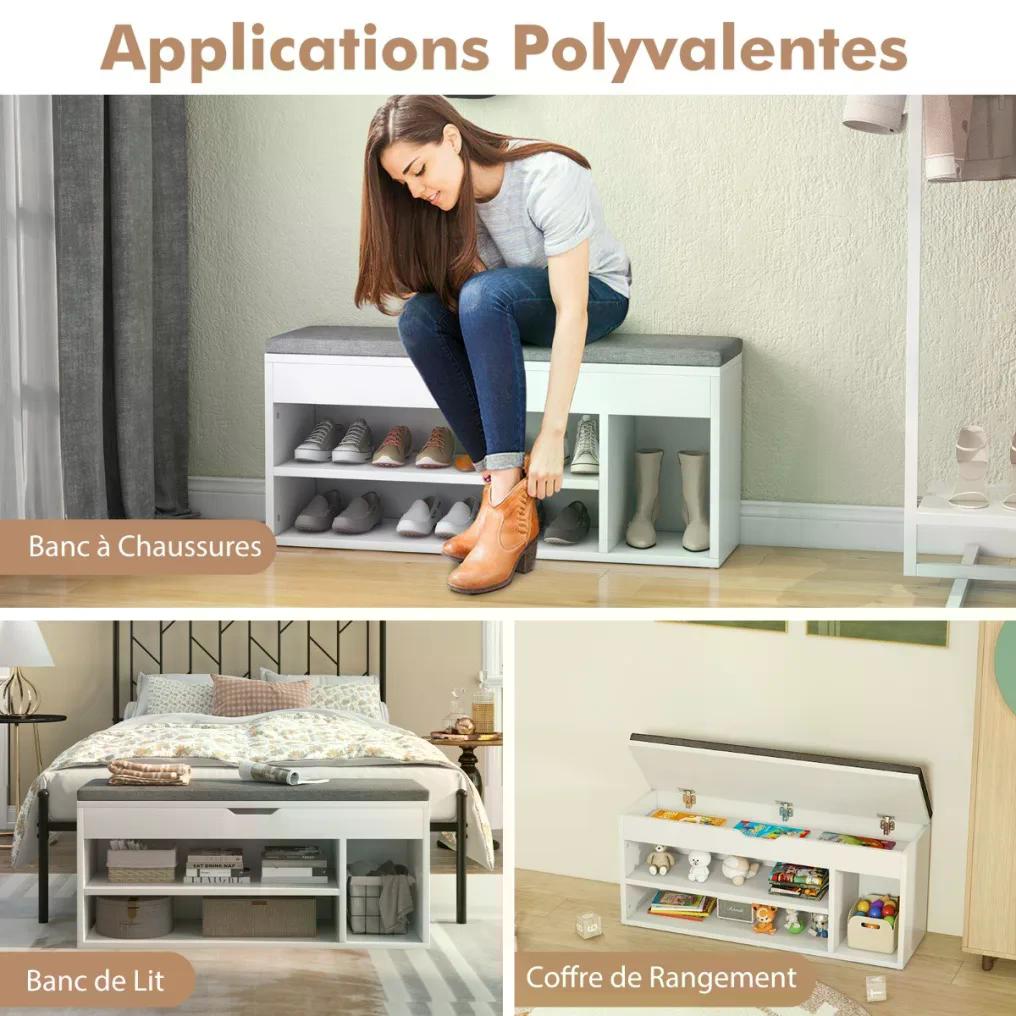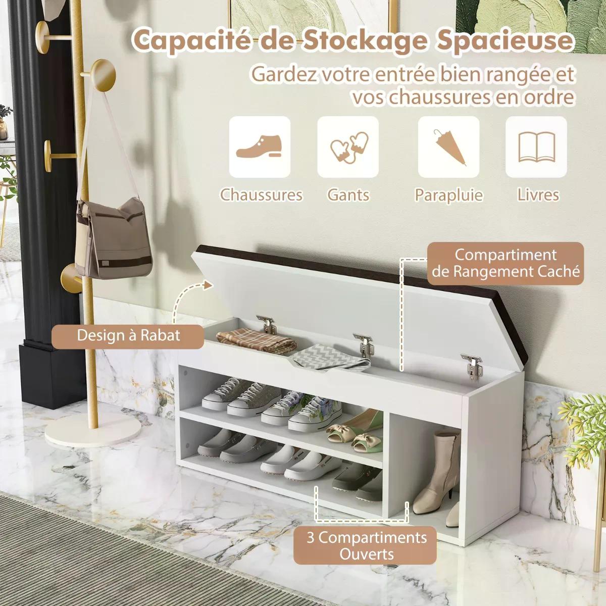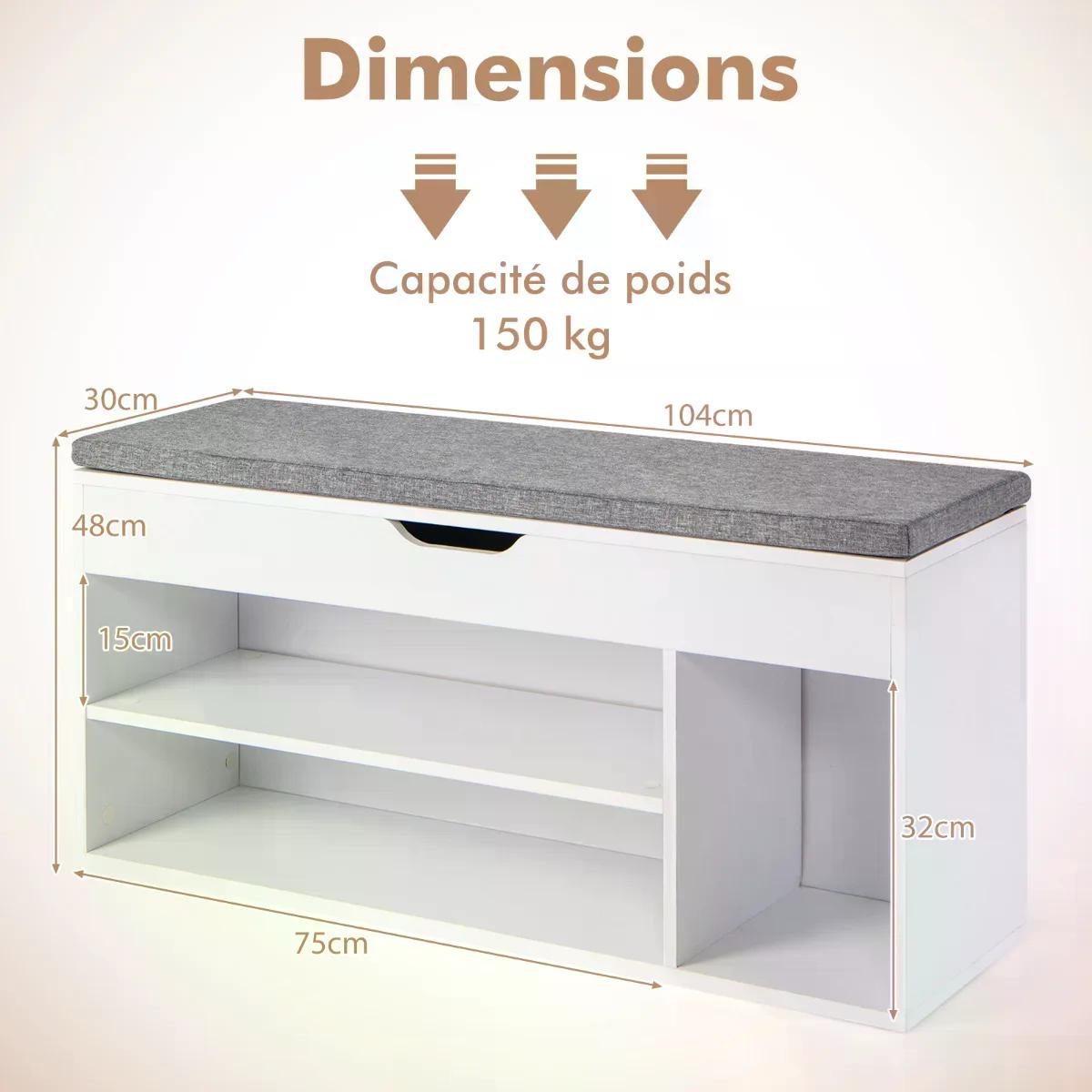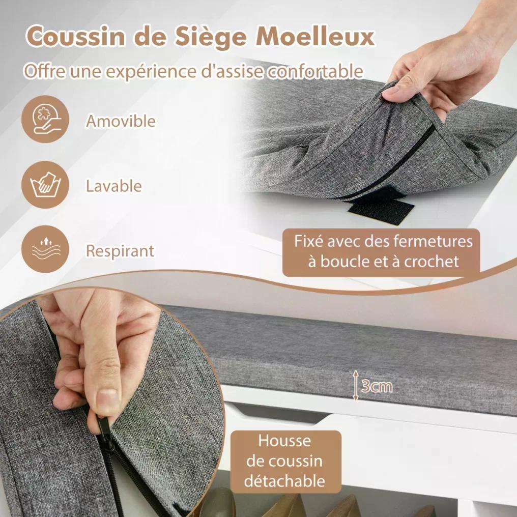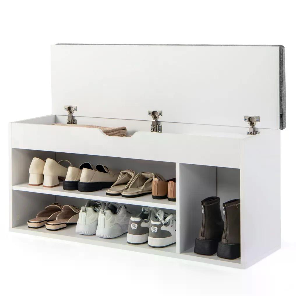 Botník s lavicí působí kvalitním dojmem a odnímatelný sedák je pohodlný. Výška police je ideální pro malé děti, které se na ni mohou pohodlně posadit. Boty lze umístit do 3 spodních přihrádek a pod odklápěcím víkem je také úložný prostor, kam lze uložit užitečné předměty, jako jsou pomůcky na čištění bot, rukavice a další drobnosti. Tuto skříňku můžete použít také jako skříňku na ručníky, malou poličku na knihy nebo CD. Lavice na boty se sedákem je vyrobena z kvalitního materiálu s jemnou povrchovou úpravou. Je robustní, odolná a módní. Nízký sedák lavice s úložným prostorem snižuje její těžiště. Botník lze přišroubovat, to znamená, že se nemusíte obávat o jeho stabilitu. Sedák je upevněn pomocí suchého zipu, takže nespadne. Lze jej snadno vyjmout a snadno vyčistit. Otvory pro šrouby nejsou zvenčí vidět, takže má krásný vzhled.