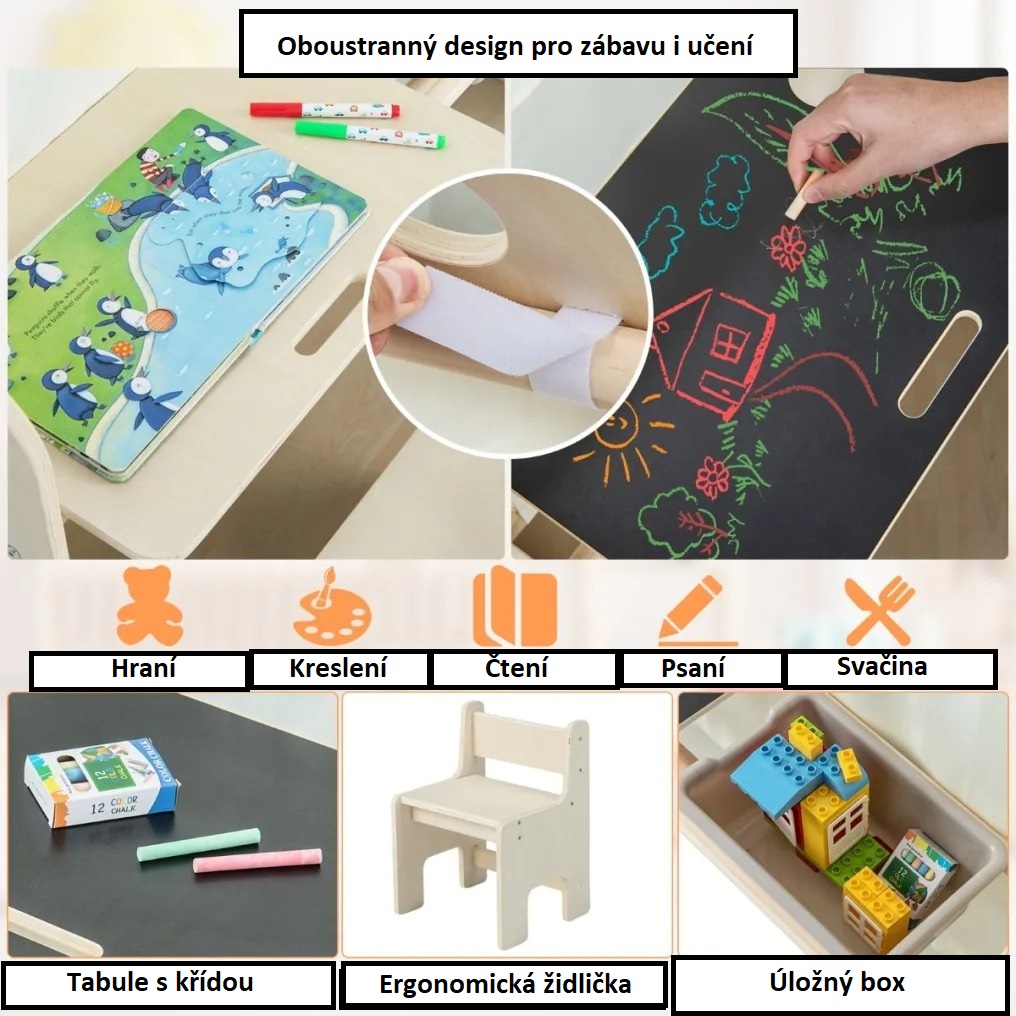 - sada stolu a židle na kreslení, učení, jídlo a hraní