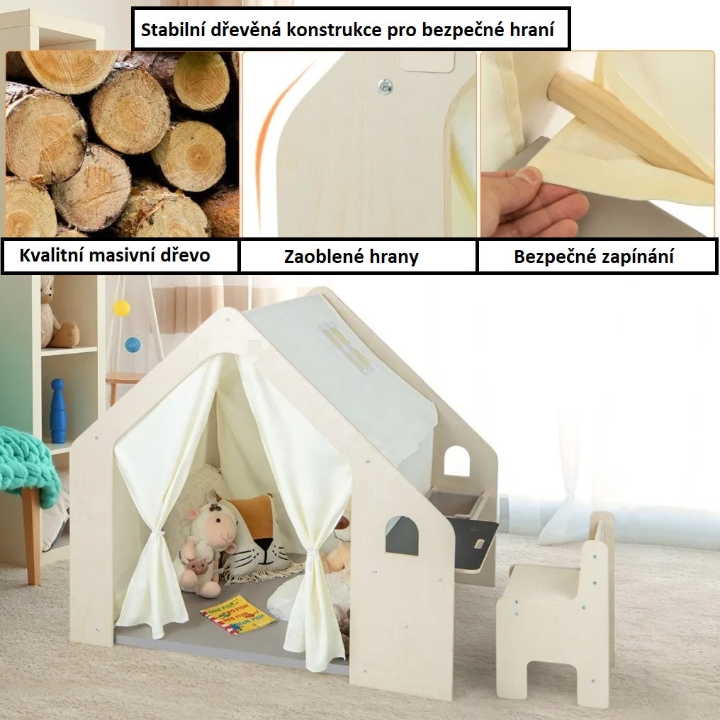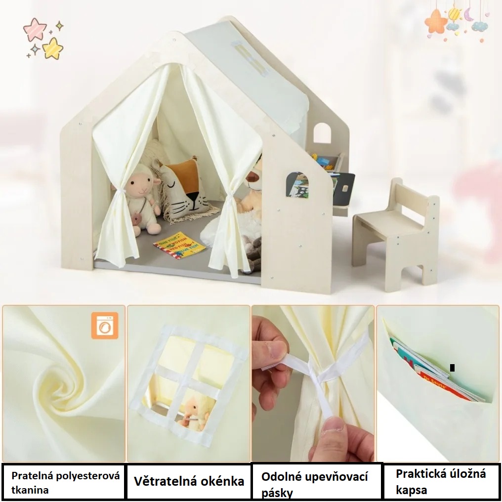 Tento interiérový domeček 6 v 1 v sobě spojuje funkci hracího stanu, podlahové podložky, tabule (včetně kříd), stolu, úložného koše a židle. Kromě toho se do něj díky velkým rozměrům vejdou 3-4 děti ve věku 2-6 let. Stan pro děti jim umožňuje užít si hodiny hraní a zlepšit jejich sociální dovednosti. Vnitřní stan s domečkem na hraní je vyrobený z desek s certifikací TSCA. Zaoblené hrany chrání děti před náhodným poraněním. Háčky a smyčky zajišťují pevné spojení pro větší stabilitu a bezpečnost. Velký hrací stan se může pochlubit odnímatelnou podlahovou podložkou z tkaniny šetrné k pokožce a také tlustou a měkkou žíněnkou pro pohodlí. Stůl a ergonomická židle mají pro děti vhodnou výšku a unesou 15 kg, resp. 60 kg. Stejně tak je stůl navržen s dětskou rukojetí pro snadné uchopení. Tento interiérový domeček Montessori, který je kombinací hracího stanu a stolní soupravy, umožňuje dětem hrát si, kreslit, číst, psát, jíst atd. Je to ideální doplněk do dětského pokoje, obývacího pokoje, školky apod. Součástí je odnímatelný úložný koš. Výhodou stanu je snadná montáž a také možnost prát odnímatelný potah v pračce. Závěsy jsou vybavené upevňovacími popruhy podle potřeby svázat.