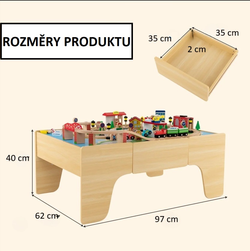 Tato 84dílná sada obsahuje koleje, vlaky, vozidla, budovy, figurky, značky, rostliny a parkovací plochu. Děti mohou volně spojovat koleje a vytvořit si vlastní město na desce stolu nebo na jakémkoli rovném povrchu. Kromě toho magnetické spojení vláčků a malovaná krajina stolní desky umožňují dětem podnikat dobrodružné výlety s kreativitou. Víceúčelový stolek má oboustrannou desku: na jedné straně je barevná mapa na hraní, zatímco na druhé straně je hladký povrch na učení. Bude se hodit na stavění vláčkodráhy, ruční práce, kreslení, psaní nebo stolování. Je také velmi snadno sestavitelný. Dráhy z přírodního masivního dřeva mají hladké hrany a leštěný povrch, který je pro děti bezpečný a snadno se udržuje. Stůl na hraní je vybaven 1 velkou výsuvnou zásuvkou, která nabízí další úložný prostor pro dětské knihy, hračky, vláčkodráhy nebo psací potřeby. Zaoblené rohy chrání děti před zraněním. Zásuvka nejenže zabraňuje ztrátě dílků, ale také pomáhá dětem starším 3 let vypěstovat si dobrý návyk k úklidu. Tento stolek je víc než jen hračka. Je to také vzdělávací pomůcka, která procvičuje praktické dovednosti a jemnou motoriku dětí a zároveň podněcuje jejich představivost a kreativitu.