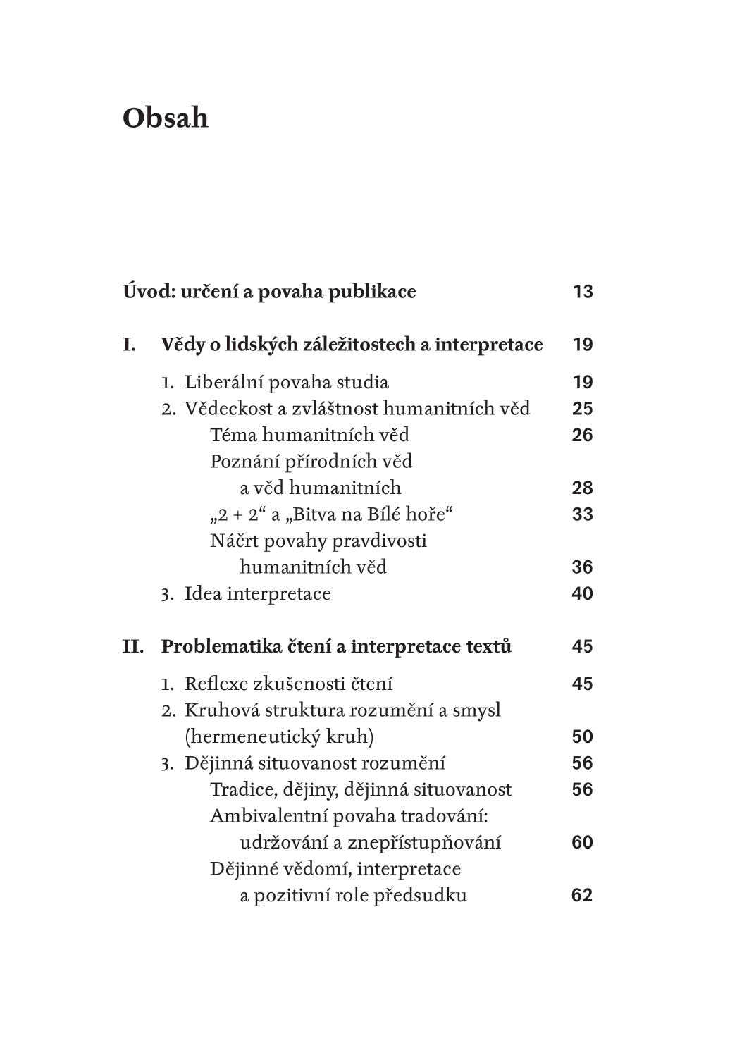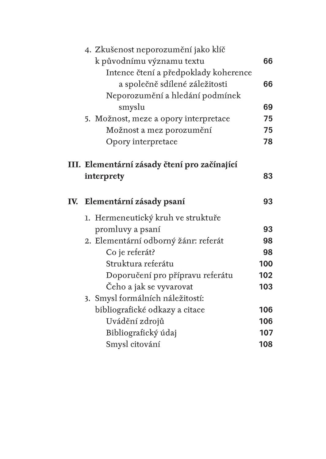 Problematika čtení a interpretování se nejprve zasazuje do širšího kontextu otázek po povaze vědění a pravdivosti ve vědách o lidských záležitostech. V dalším výkladu se pak vychází z odkrytí základních problémů, jež spočívají ve čtení a porozumění textům, aby se teprve z nich odvodily jisté nejelementárnější zásady interpretace a propedeutická doporučení pro práci s texty. Teoretickým pozadím předkládaných výkladů je především obšírné rozpracování této problematiky v moderní hermeneutice u H.-G. Gadamera.