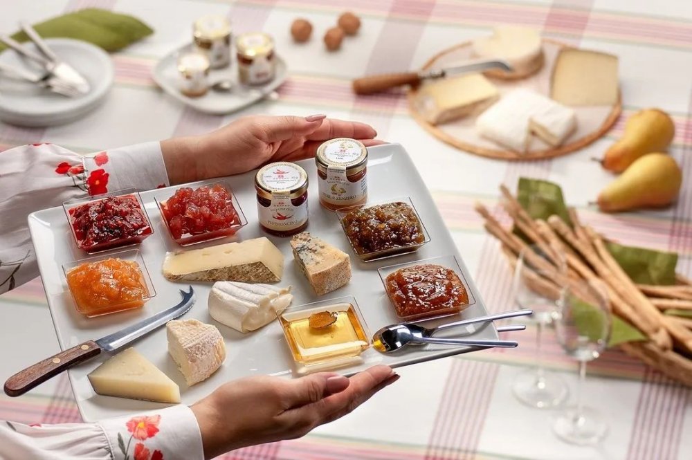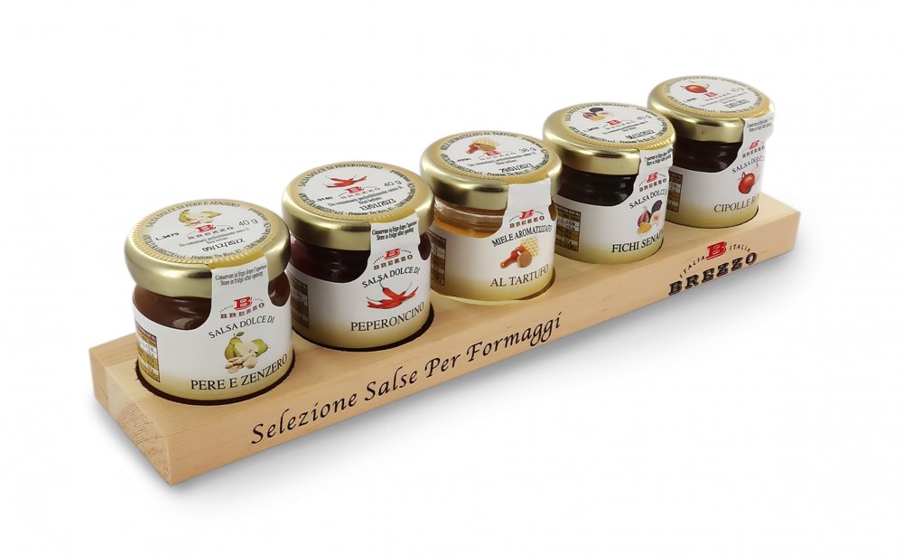 To nejlepší z našich džemů k sýrům na pěkném dřevěném podstavci. ,