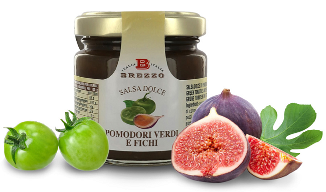 Sladká omáčka ze zelených rajčat a fíků: zelená rajčata 40 %, hnědý cukr, fíky 19 %, citrony s kousky kůry, hřebíček.