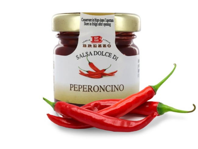 Sladká chilli omáčka: červené chilli papričky (70 g x 100 g), papriky (45 g x 100 g), třtinový cukr.