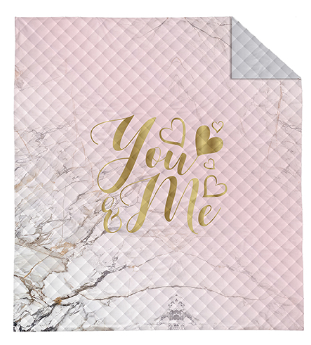 Přední strana je ve světle růžové barvě s nápisem You & Me, zadní strana přehozu je světle šedá – dohromady tak perfektně dotváří atmosféru pokoje. Rozměr 220×240 cm padne na většinu dvojlůžek.