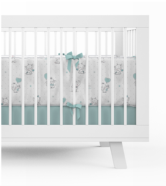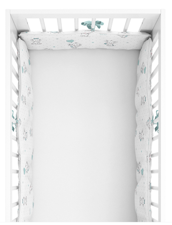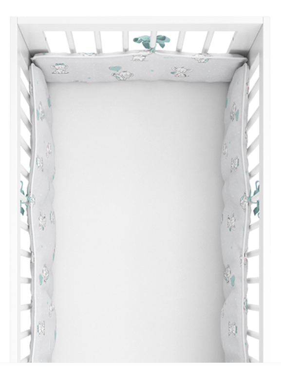 Chcete aby se vaše miminko cítilo v postýlce v bezpečí? Pokud ano, určitě mu pořiďte mantinel. Měkký a jemný oboustranný mantinel je dokonalá a pohodlná ochrana pro dítě. Chrání miminko před případným udeřením se během spánku nebo hry. Díky šňůrkám se dokonale přizpůsobí postýlce. Je oboustranný, z jedné strany je tmavě šedá se sloníky a z druhé strany světle šedá. Motiv doplňují tyrkysová srdíčka. Mantinel má rozměr 30x180 cm. Přichycením šňůrkami k postýlce tak vytvoříte ochranný prostor.