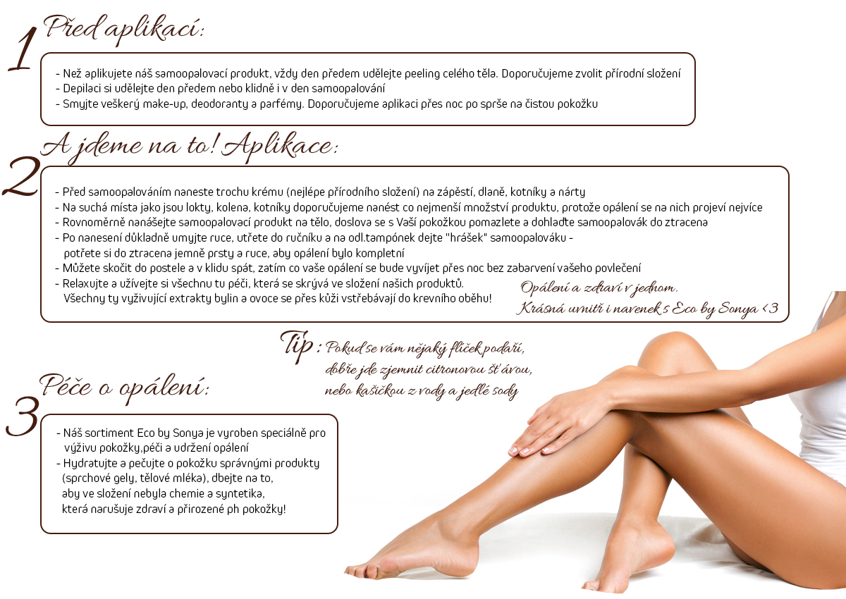 Produkt obsahuje samoopalovací složku dihydroxyacetone přírodního původu (derivovanou z cukrové třtiny). Je vhodný i pro těhotné a kojící ženy.