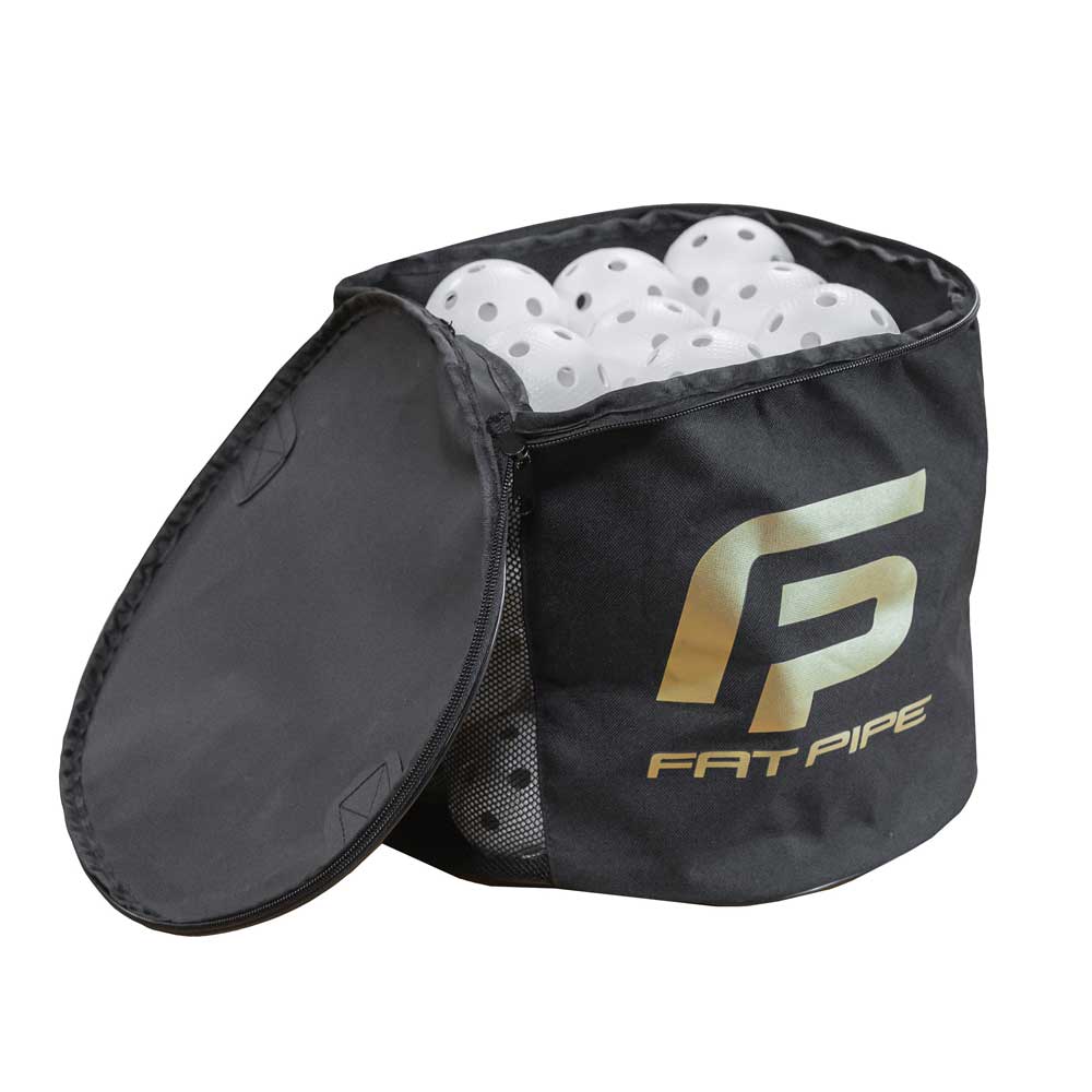Vak na florbalové míčky od značky Fatpipe do kterého se vejde 50 míčků. V přední části je zvýrazněn nápis a logo Fatpipe.