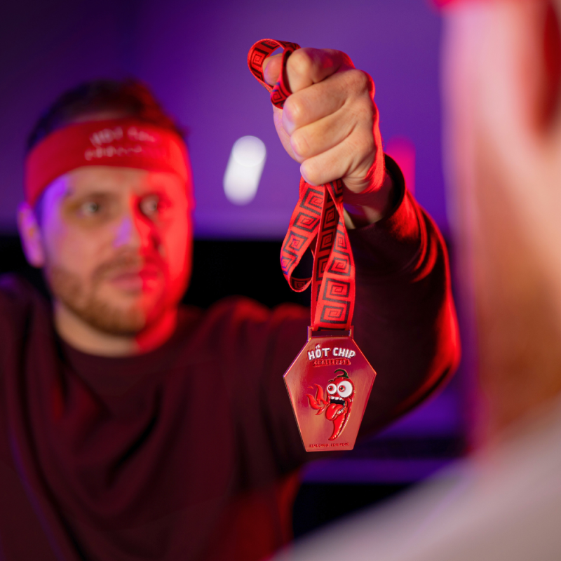 Vyzvěte kamaráda na souboj o největšího odvážlivce! Duel Challenge Box obsahuje vše pro ultimátní duel: 2x HOT-CHIP CHALLENGE – nejpálivější tortilla chips na světě, stylové čelenky, certifikáty, náramky a unikátní medaili pro vítěze. Kdo zvládne sníst chips rychleji?