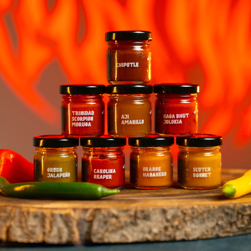MASHBOX 8 x 35ml je sada osmi prémiových chilli pyré vytvořených jen z papriček a soli. Žádné přidané příchutě, jen autentická chuť světově nejoblíbenějších odrůd chilli různých stupňů pálivosti. Perfektní ingredience do teplé kuchyně pro všechny, kdo chtějí vařit s opravdovou a plnou chutí chilli.