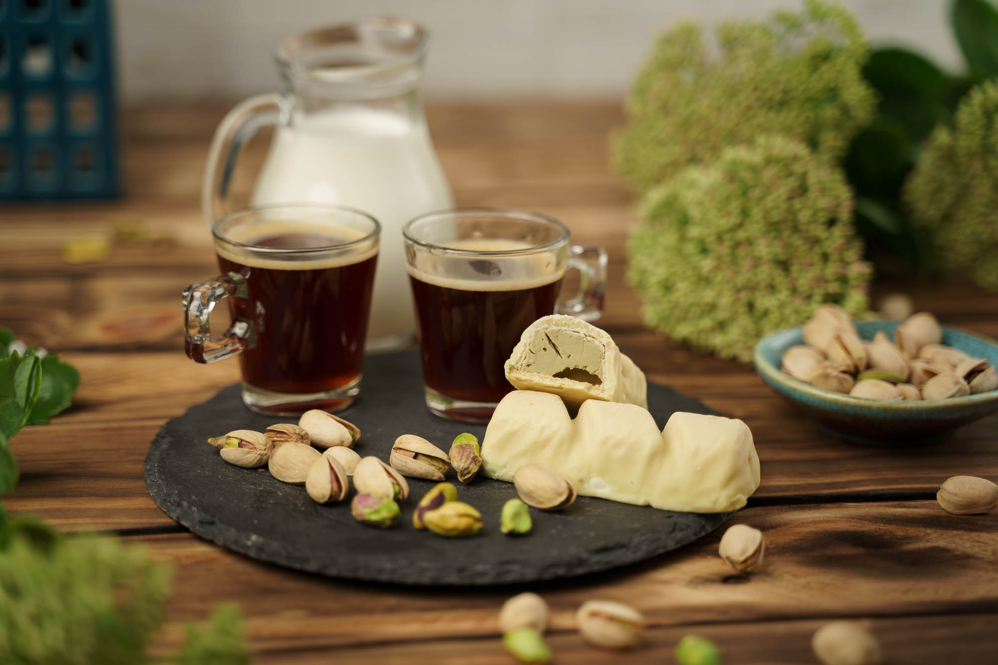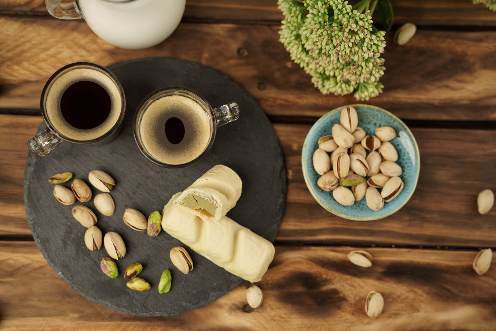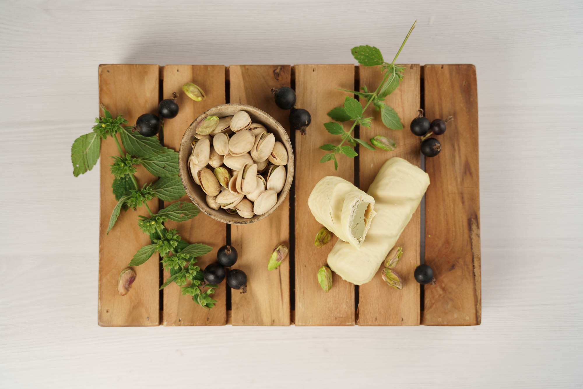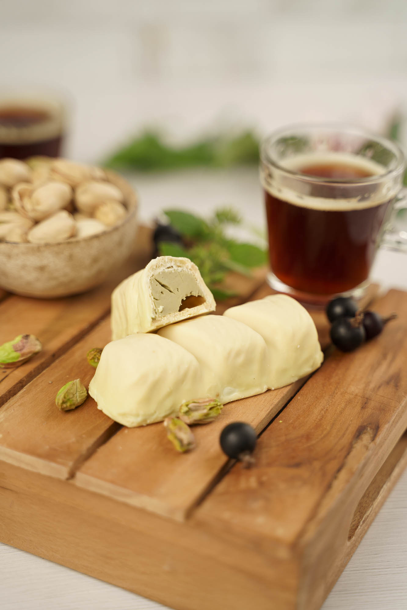 Sametová pistáciová náplň uvnitř velké křupavé oplatky. Ponořená do bílé čokolády.