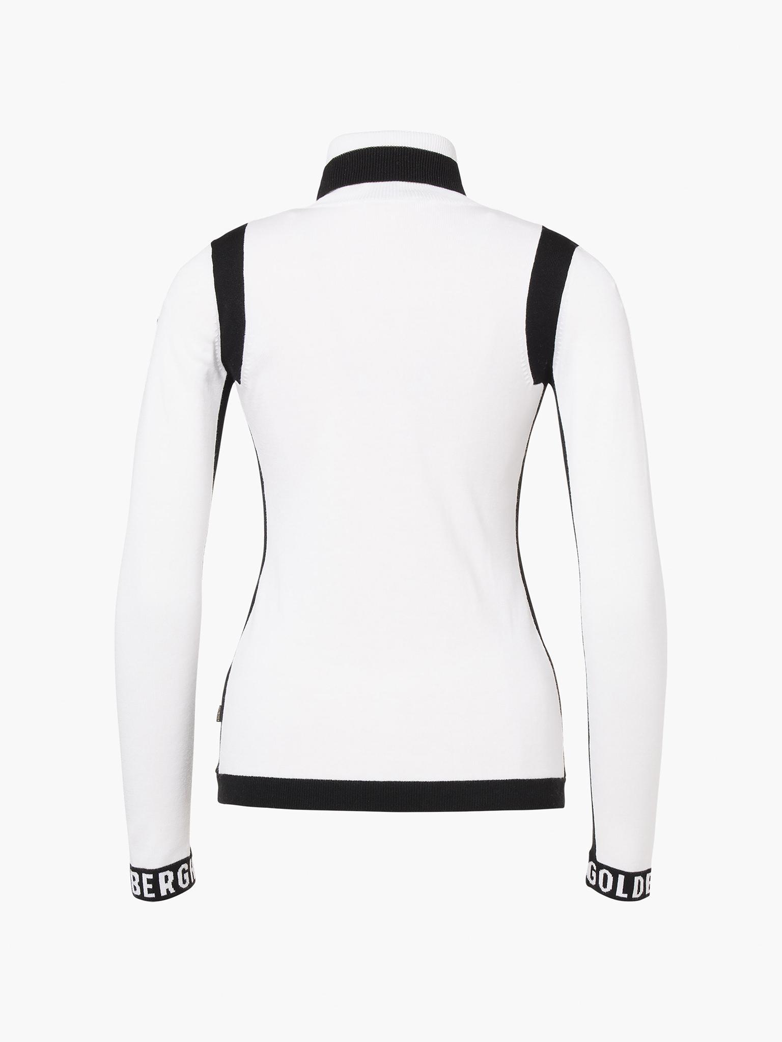 Dámsky svetrový rolák NOEMI je upletený z kvalitnej jemnej priadze, ktorá spája výhody akrylu, hrejivej merino vlny a odolného nylonu. Vďaka slim fit strihu a priliehavému stojačiku pekne obopína postavu a je ideálny ako stredná vrstva pod bundu. Na hrudi je výrazný pletený nápis "Goldbergh Ski" v kontrastnej farbe, ktorý sa opakuje aj na manžetách. Detaily dopĺňa kovové logo na rukáve a tkaný štítok na bočnom šve.