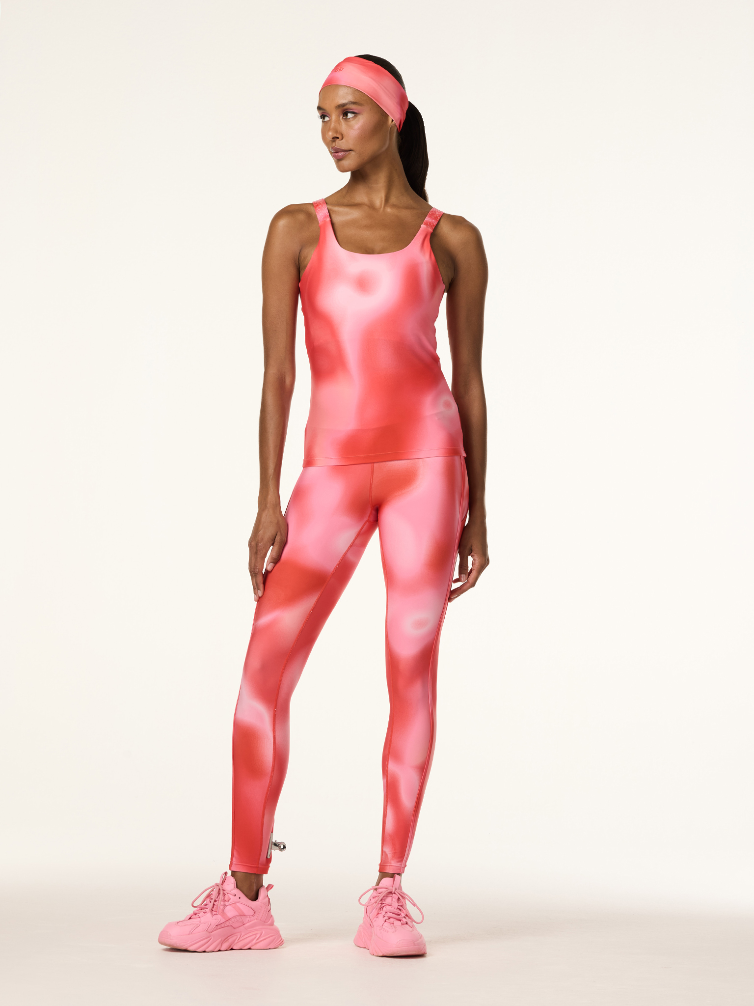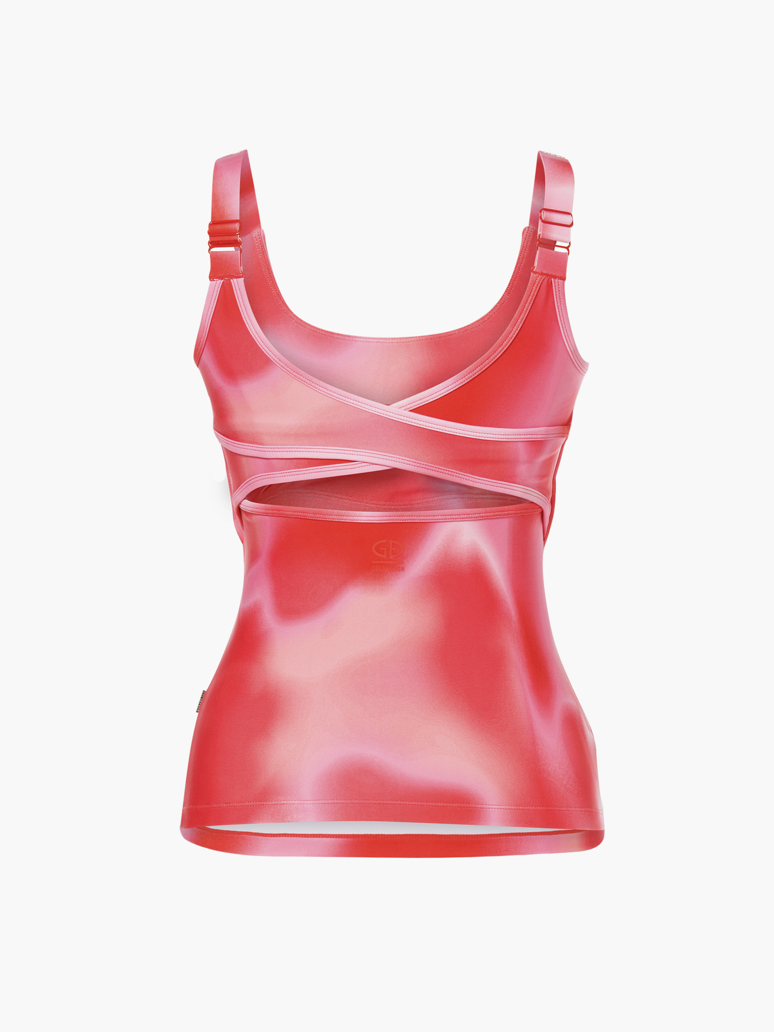 Top s podprsenkou Flamme je ideálnou kombináciou štýlu, komfortu a podpory. Tento top s úzkym strihom obsahuje pevnú vnútornú podprsenku pre strednú podporu, ktorá poskytuje pohodlie pri aktívnych aktivitách. Skrytý háčik a očko umožňujú ľahké zapínanie, zatiaľ čo nastaviteľné ramenné popruhy zaisťujú prispôsobiteľnosť. Celoplošný Lumina Sunset tlačený vzor spolu s detailmi ramienok na prednej strane dodáva kúsku sofistikovaný vzhľad. Powermesh panely v strategických miestach poskytujú extra podporu, čím zvýšia pohodlie počas nosenia. Na zadnej strane sa nachádza potlač loga GB v odtieni Sunset z gumy a tkaná značka na postrannom šve, čo dodáva topu moderný športový vzhľad. Je vyrobený z materiálu, ktorý je priedušný, rýchloschnúci a proti-zápachový, takže je ideálny na každodenné nosenie.