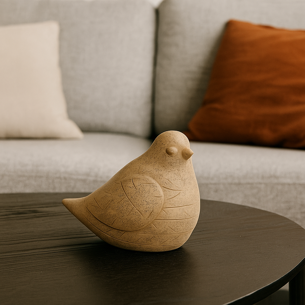 Tento dekorativní ptáček imituje povrch světlého dřeva, přesto je vyroben z odolného polyresinu. Spojuje vzhled přírodního materiálu s praktickými výhodami moderního zpracování – je lehký, pevný a odolný proti poškození.