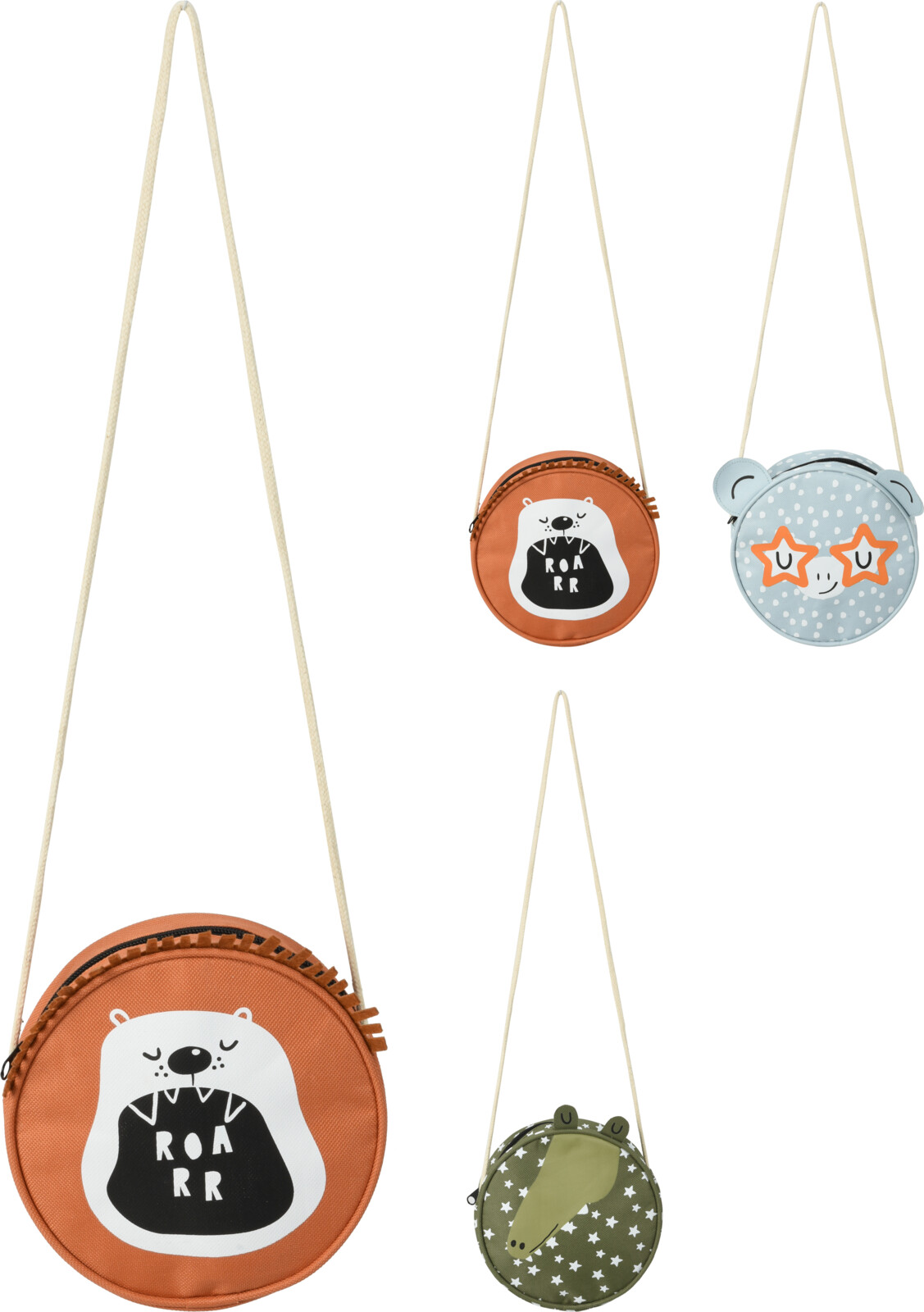 Kulatá kabelka (peněženka) s popruhem přes rameno a zapínáním na zip. Bezpečné uschová všechny potřebné maličkosti, které potřebuje malá slečna i malý getleman, ať už jdou do společnsti nebo do přírody.