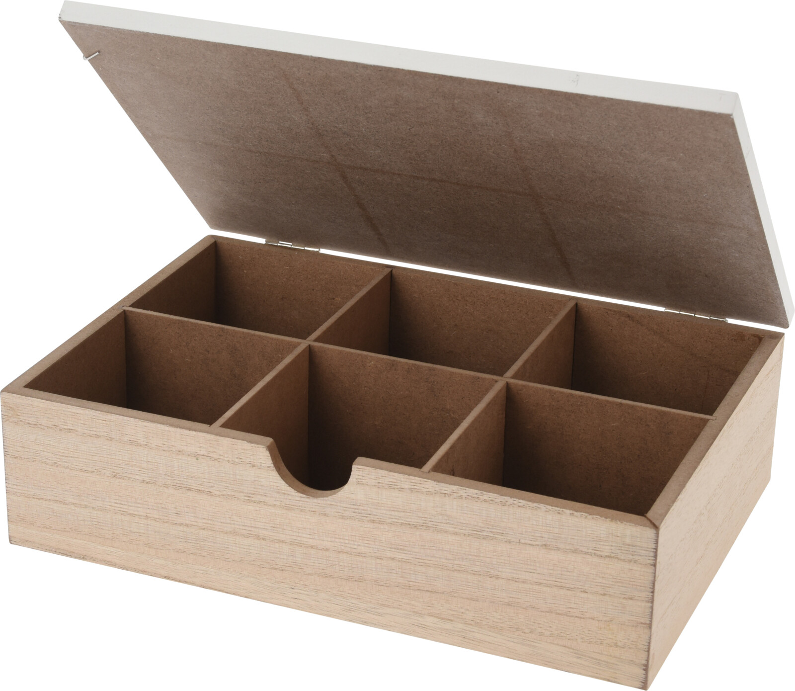 Krabička na čaj disponuje šesti přihrádkami. Víko boxu je v bílé barvě s potiskem.