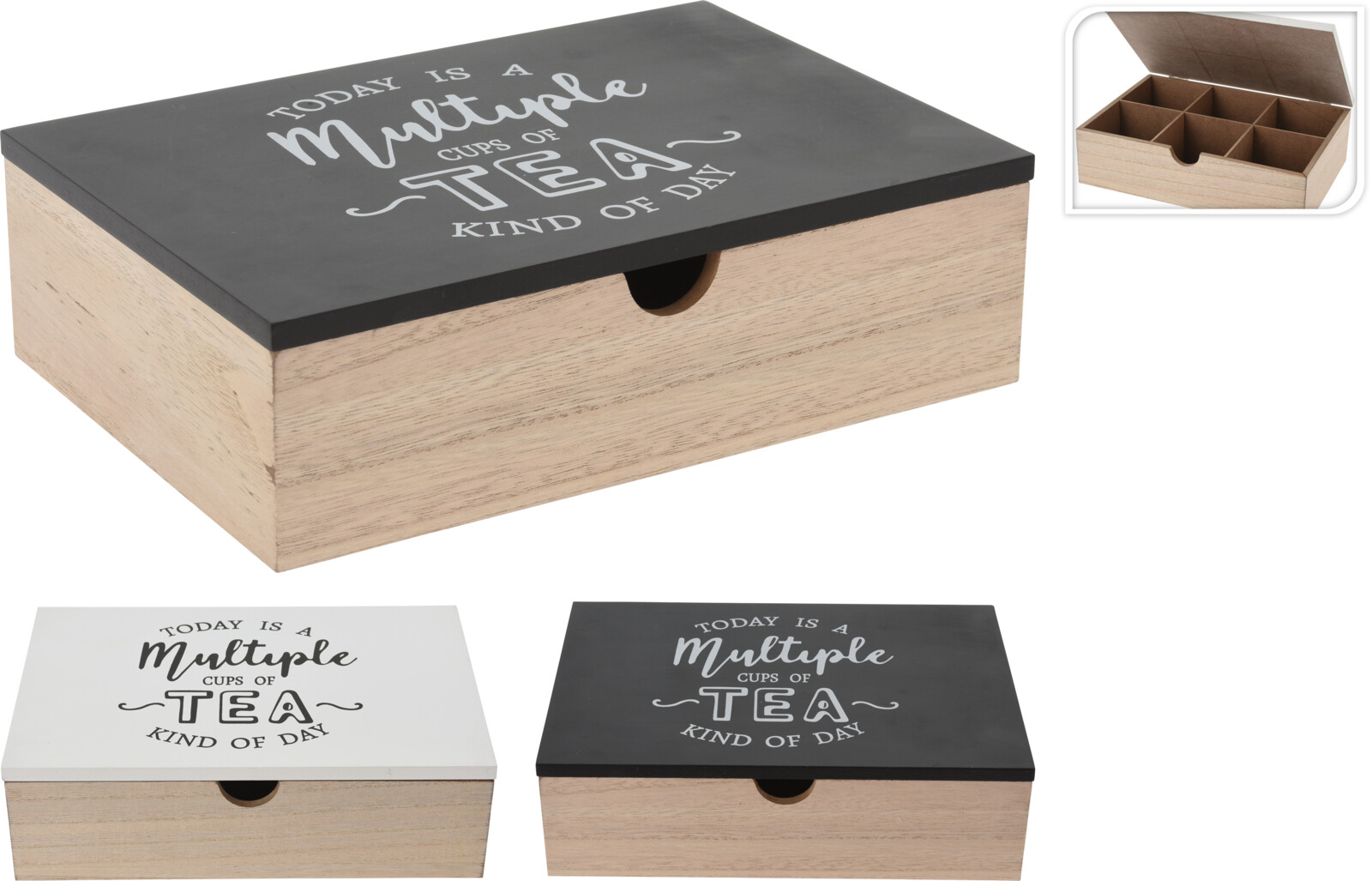Dřevěný box na ukládání čajových sáčků. Krabička na čaj disponuje šesti přihrádkami. Víko boxu je v bílé barvě s potiskem. Ideální pro ukládání různých čajů. Vš…
