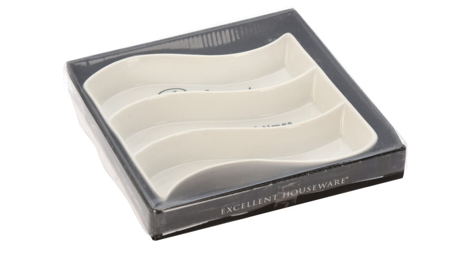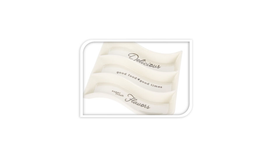 Mistička na olivy nebo na jiné pochutiny např.oříšky, sýry ve tvaru vlny. Dělená miska má bílou barvu, dekor tvoří černé nápisy "Delicious" a "Flawours".