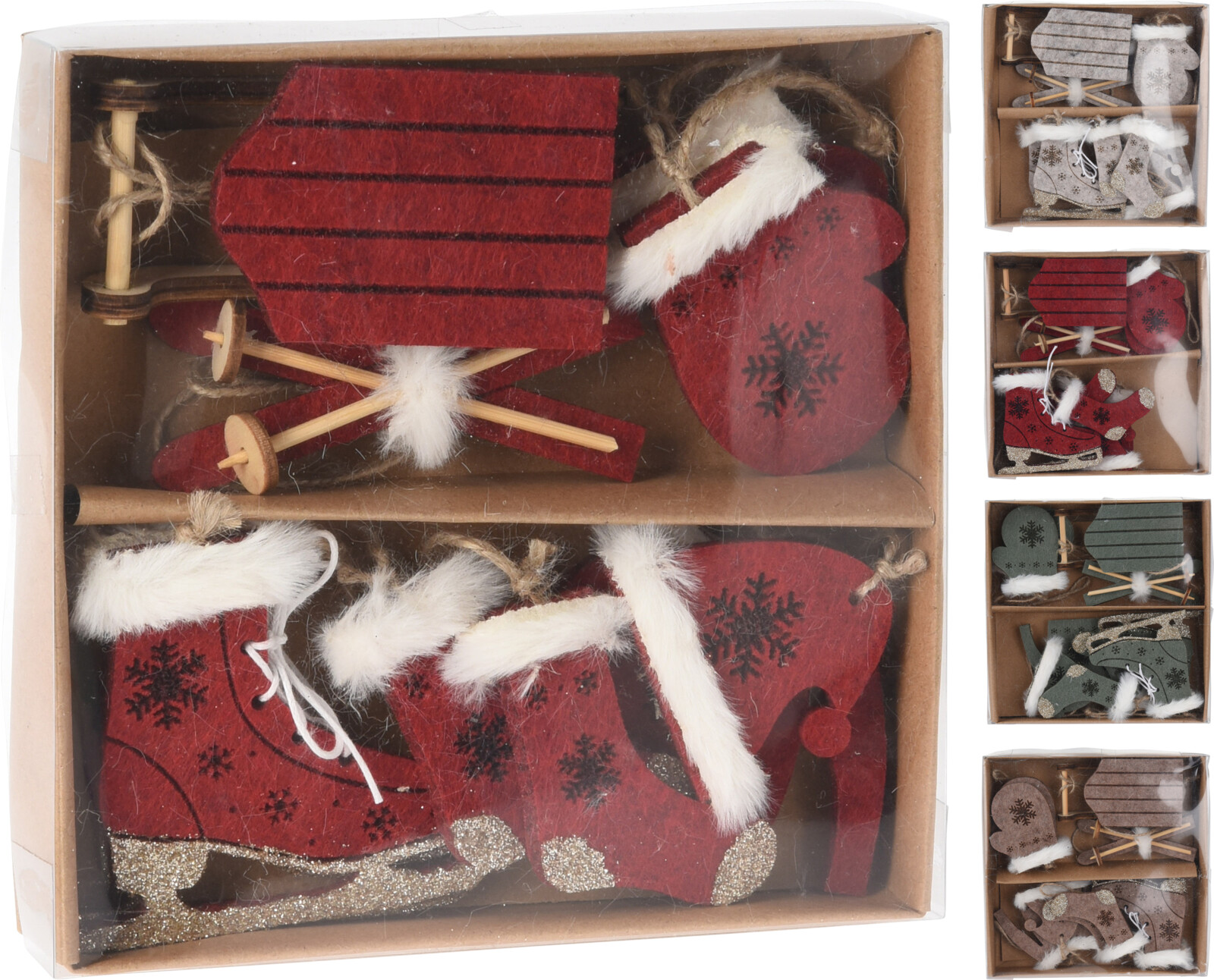 Souprava vánoční filcových dekorací k zavěšení a položení v dřevěné krabičce. Sada vánočních ozdob obsahuje: 1x sáňky 1x lyže 2x rukavice 2x ponožky 1x čepici 1…