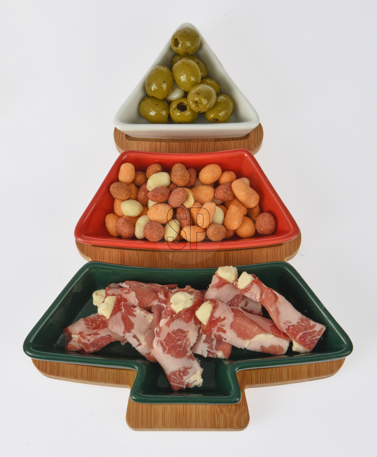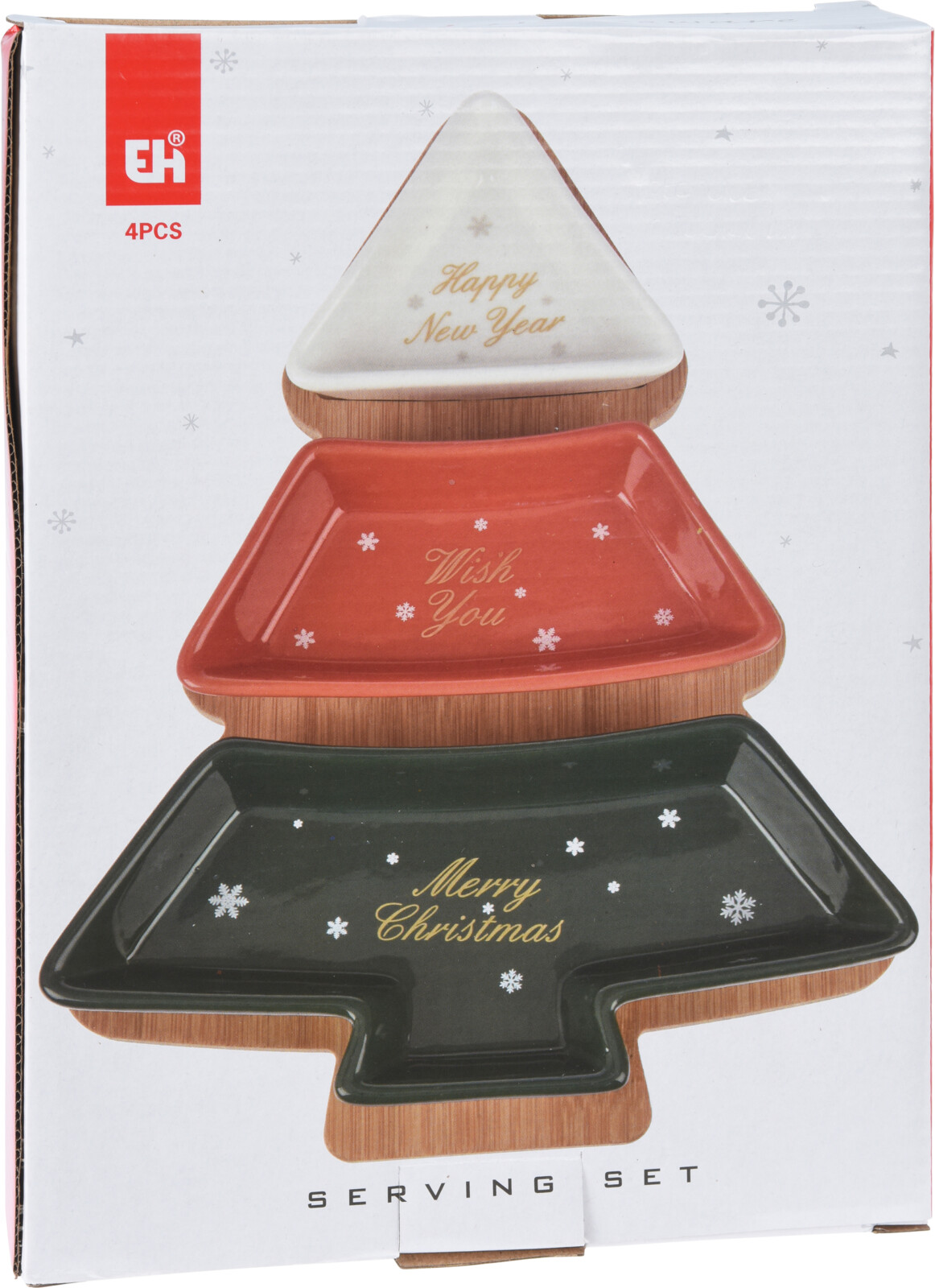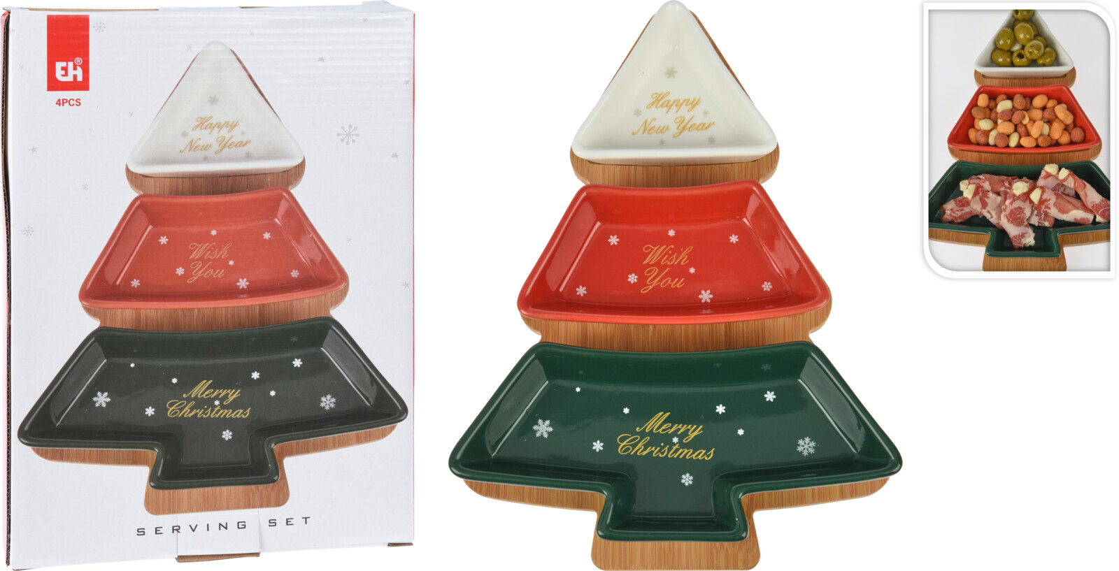 H&L Servírovací sada Stromeček: Bambusový tác a 3 kameninové misky se zlatou (27x20x4 cm)