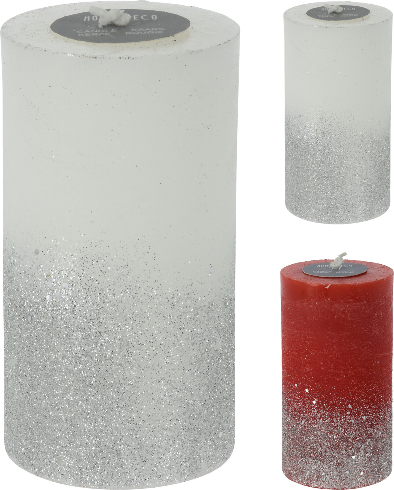 Svíčka o průměru 7 cm a vysoká 13 cm ozdobená jemným třpytem v dolní části.