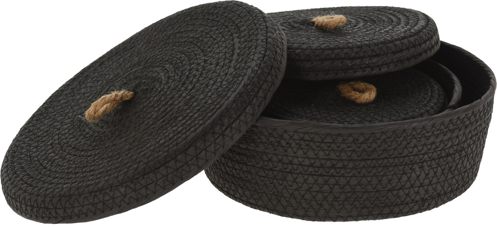 Největší košík z řady BlackTwist je skvělým pomocníkem pro ukládání větších předmětů – od šátků a punčoch, až po nabíječky nebo kreativní potřeby. Je vyroben z pevného papírového kompozitu v černé barvě a doplněn praktickým víkem s jutovým poutkem. Rozměr Ø 26 × 10 cm zajistí dostatek prostoru a elegantní vzhled se hodí do jakéhokoliv moderního interiéru.