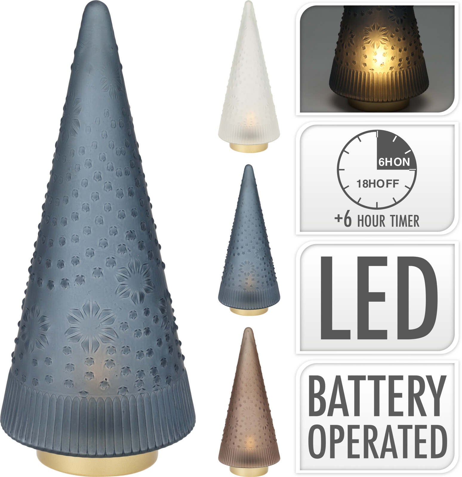 Skleněný vánoční stromek je k dispozici ve třech různých barvách - bílá, hnědá a modrá. Každá verze přináší do vašeho domova jedinečný nádech vánočního kouzla.