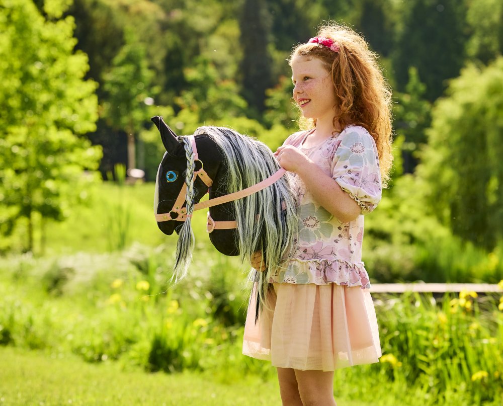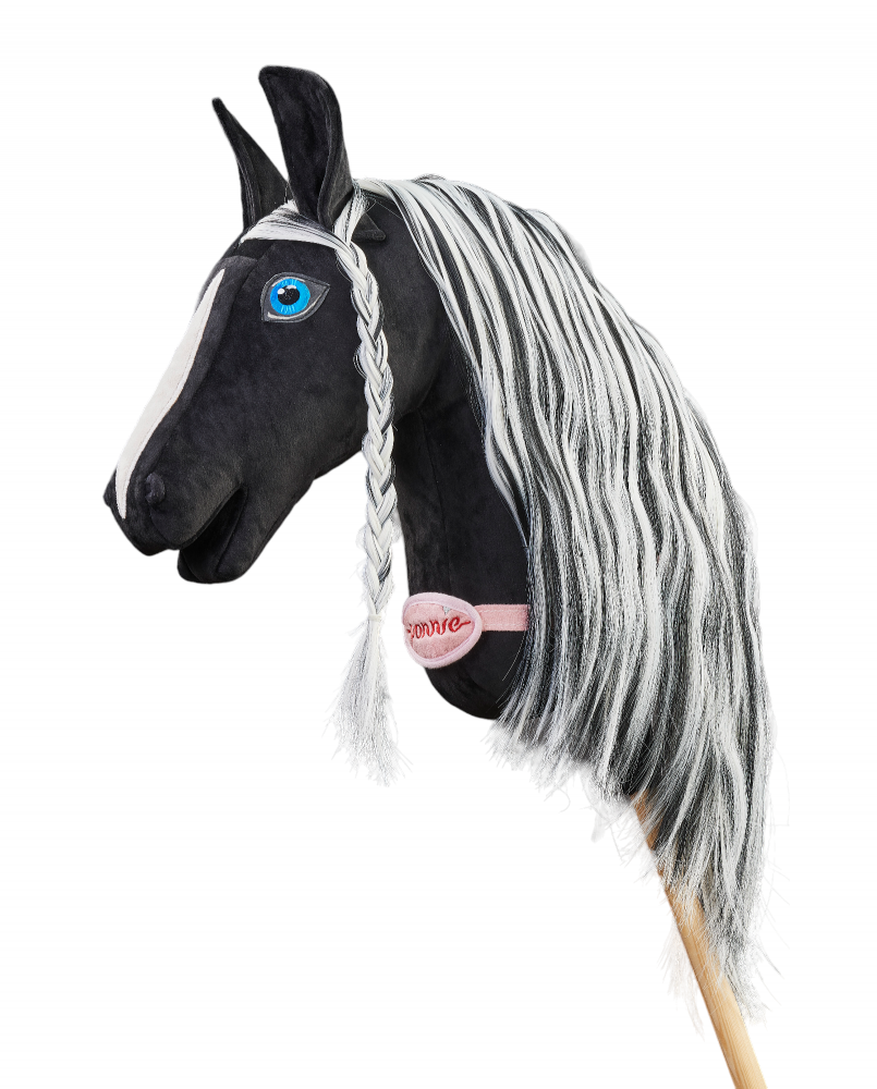 Tajemný a krásný je Hobby Horse Ponnie Barock Pinto s růžovou ohlávkou s uzdou s možností odepnutí. Černá srst, bílá lysinka a bílo-černá hříva, kterou lze česat i zaplétat, jsou jeho poznávacími znaky. Modré oči prozrazují nespoutanost. Jeho síla a houževnatost se budou při náročných trénincích i závodech hodit. Tento hřebec je jen pro nebojácné jezdkyně, které chtějí vyhrávat.